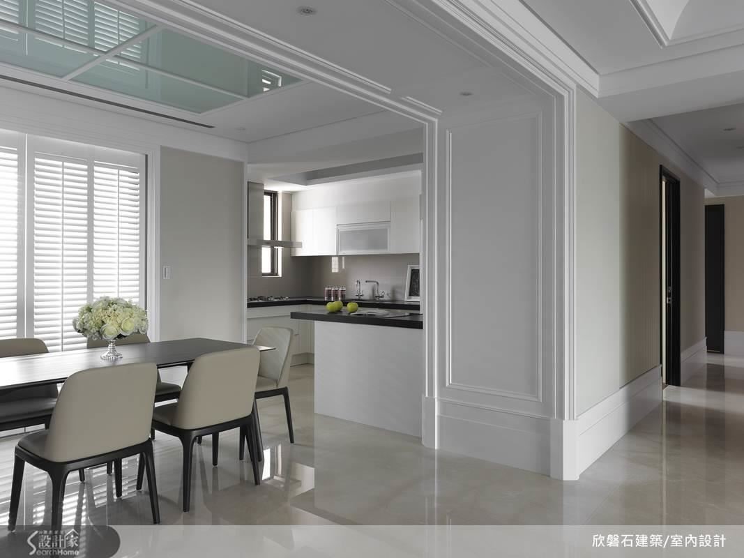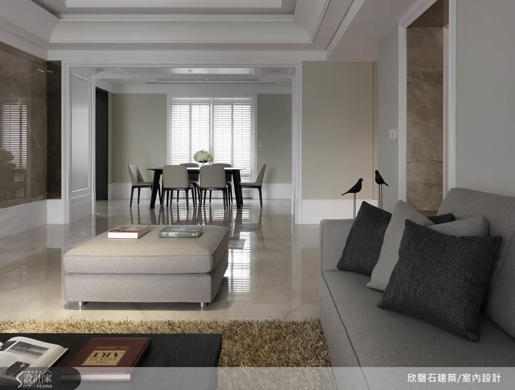 想要呈現豪宅大器的開闊感,在格局配置上也需要精準拿捏。設計師利用建築物本身的樑柱結構包覆它並加以美化,過道以線板的典雅巨型門框串聯,點綴出英式古典的氛圍,又區隔了客廳與餐廳。將客餐廳置於同一軸線,光線、視野穿透開闊,一看就有好心情。