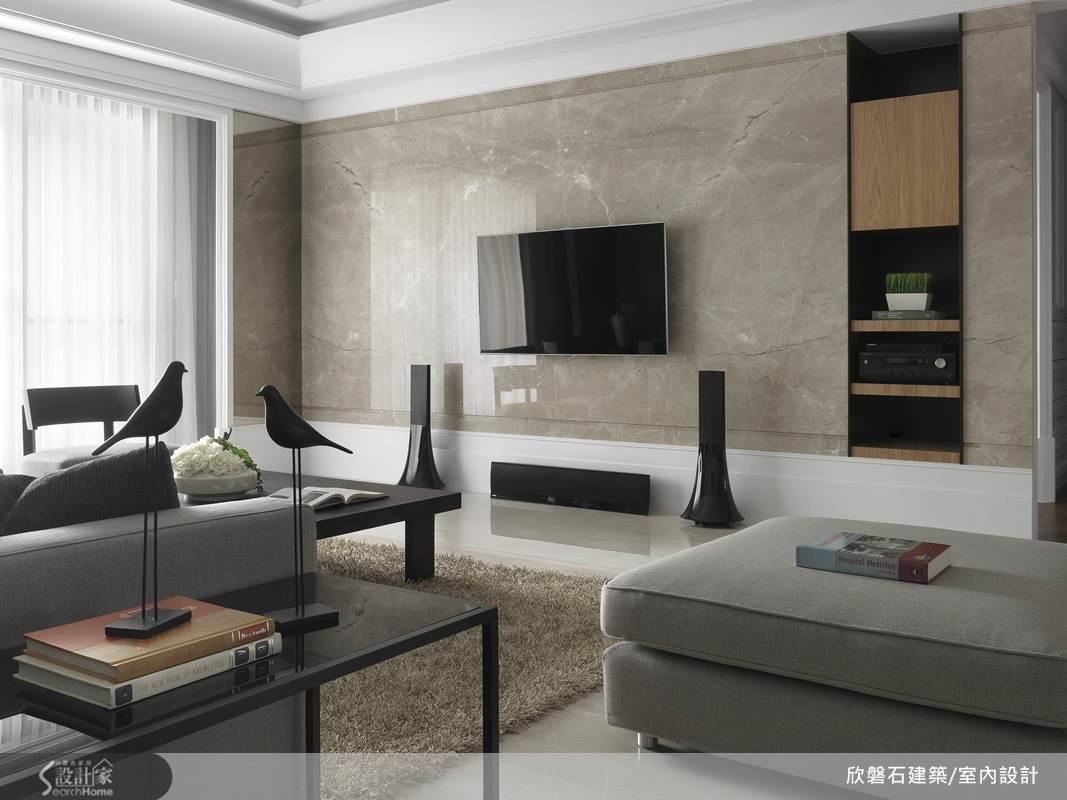 由於此為新成屋,在空間上僅更動主臥入口,原本主臥入口位置在靠近陽台處,設計師建議改到電視牆的右側,如此一來不會破壞客廳整體的空間尺度,可保留電視牆面的完整性,讓楓丹白露大理石所打造的電視牆面看起來更有延伸感。最重要的是,每每進出主臥房也不需要都經過電視機前面,整體動線更順暢,也減少空間的壓迫感。
