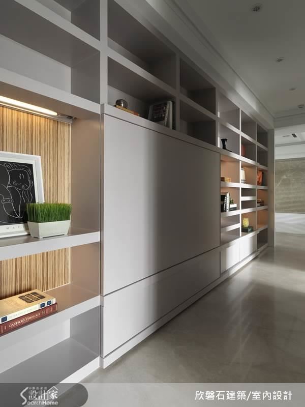 屋主夫妻的職業為醫師與老師,兩人皆喜愛閱讀,家中有豐富得藏書,其中不乏各國的原文書,需足夠的書櫃收納空間。原本走廊的距離太寬,若未妥善規劃,會變成浪費空間。而設計師依據屋主需求規劃整排頂天立地的巨型書櫃,牆面使用斑馬木皮搭配柔和耐看的霧鄉色層板,內部植入鐵件,層板的跨距加大,收藏再多的厚重原文書也不擔心,具設計感的書櫃讓原本的廊道不顯單調,更具裝飾性與機能性。