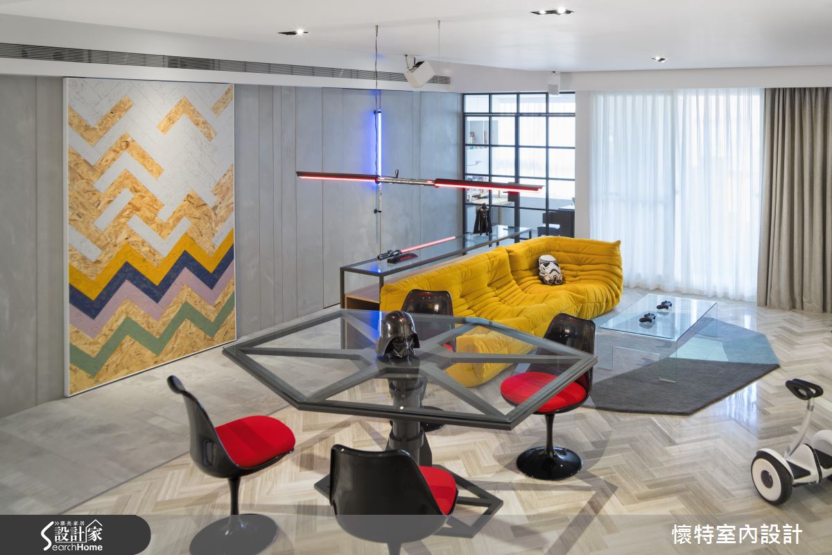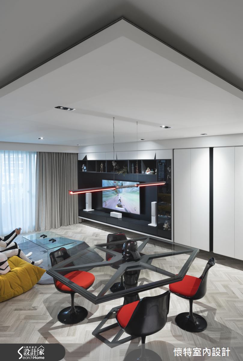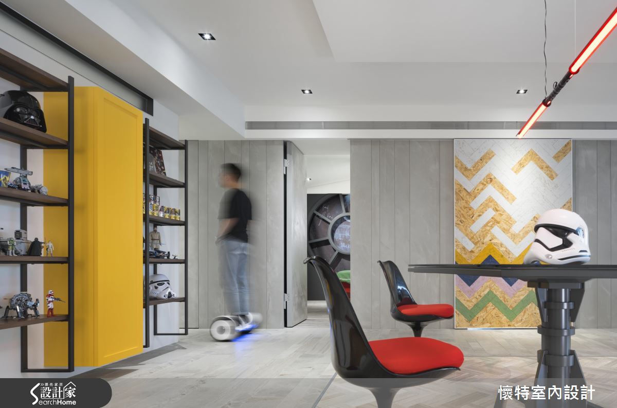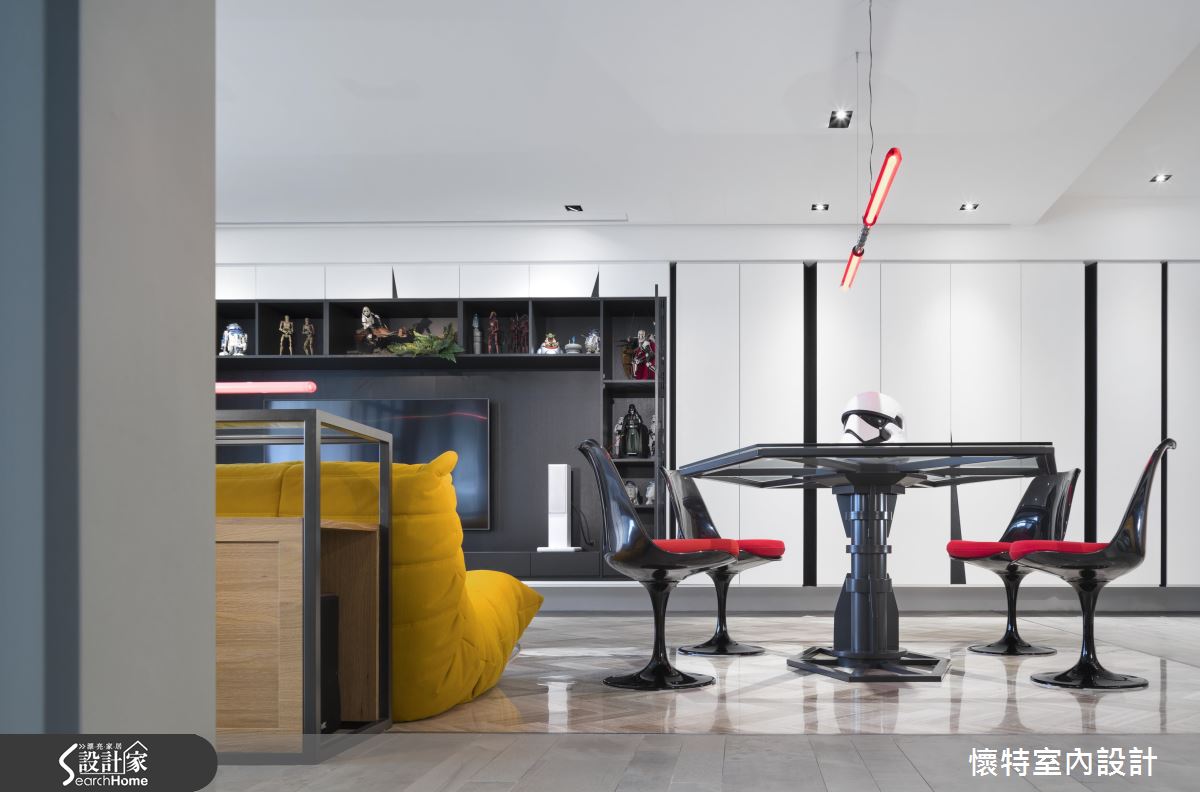 名為「原力」的住宅,出自星戰中的核心概念「the Force」,室內以俐落的黑、灰、白為主軸,大膽的鮮黃、亮紅,不僅鮮豔吸睛,也是星戰中常見的經典配色。餐桌由帝國軍的鈦戰機作為靈感發想,餐椅的黑、紅搭配,更是帝國軍的代表色,一旁的收納櫃體特意凸顯不規則的黑色槽縫,象徵著戰爭後的裂隙痕跡,彷彿剛經歷一場光劍對決激戰,也巧妙呼應了餐桌上的光劍燈飾及櫃體把手;而廚房門片造型設計引申自戲中的塔圖因星沙漠,另外,可以注意到公領域的地坪材質特別做出區分,也正代表著正義和邪惡兩者勢力間的對抗分距,相當具有巧思。