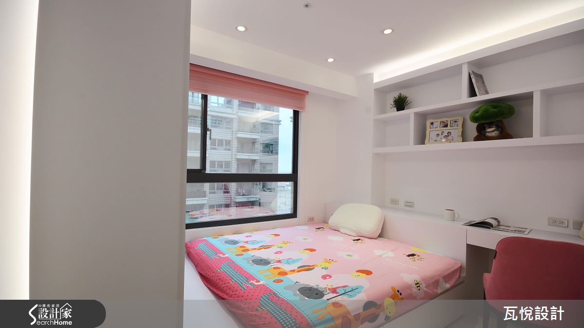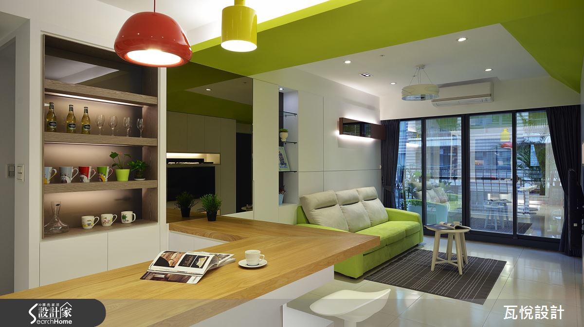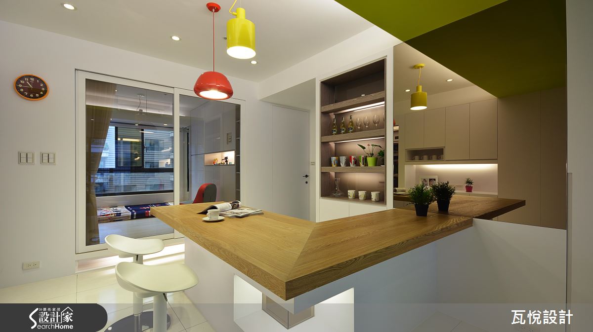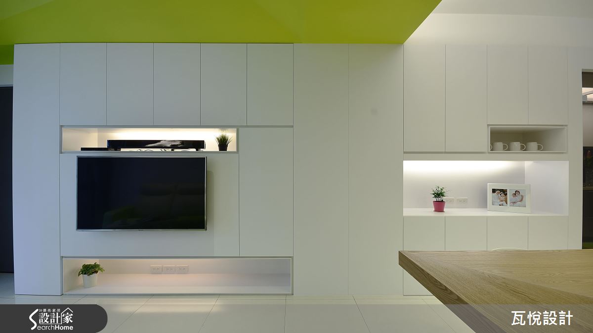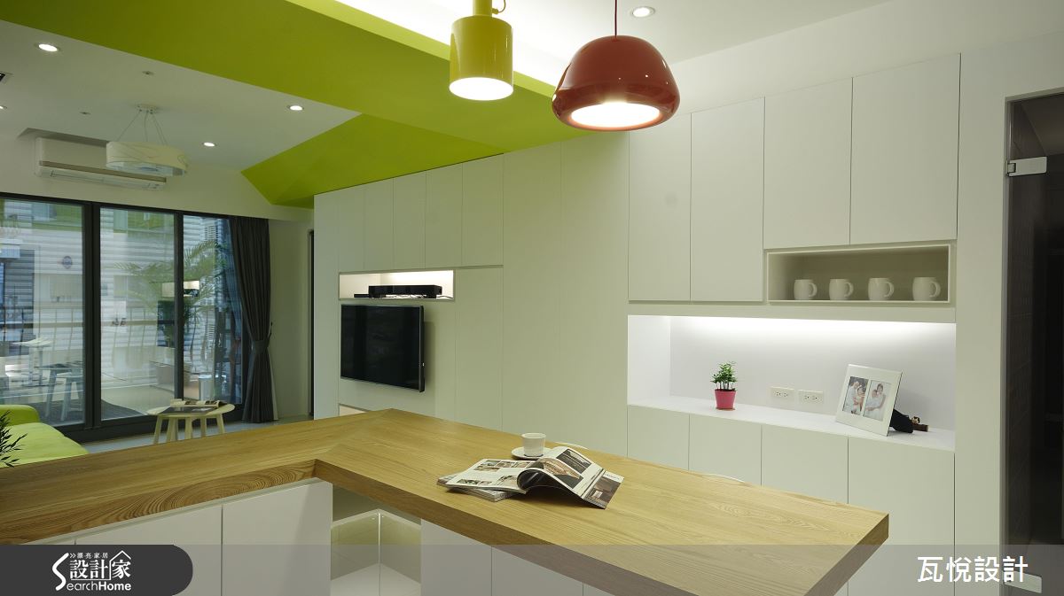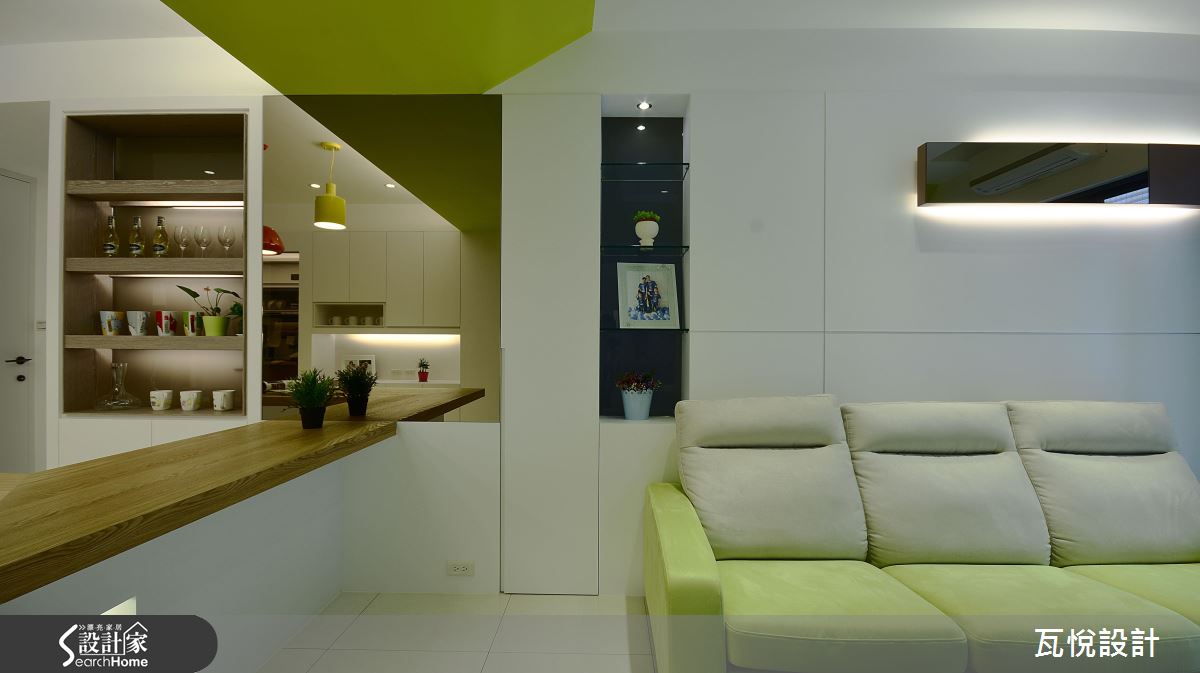 由於餐廳上方有一支大樑貫穿,而讓整體公領域顯得相當壓迫,更有著樑煞的風水問題,因此利用塗刷檸檬綠的大面積 L 型木作進行化解,由缺化優成為亮點端景,更能與同色系家具產生呼應。電視牆與沙發背牆以線條俐落簡約的設計為主,並以一面茶鏡串連開放式客餐廳,更增加內嵌式展示櫃更讓收納轉換為空間端景。以 L 型吧台取代餐桌,打造全家人用餐、孩子複習功課、工作桌等多元用途,下方更建置收納機能。設計師將男孩房地坪墊高,讓男孩房功能性大增,抹除格局限制;女兒房更加入可愛的粉紅元素,滿足孩子的想望。