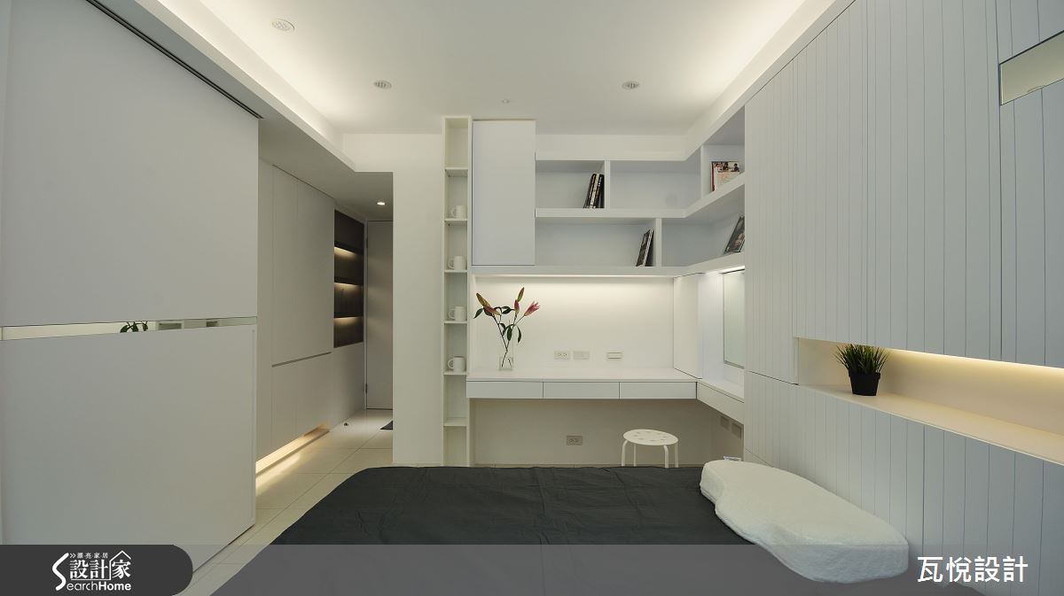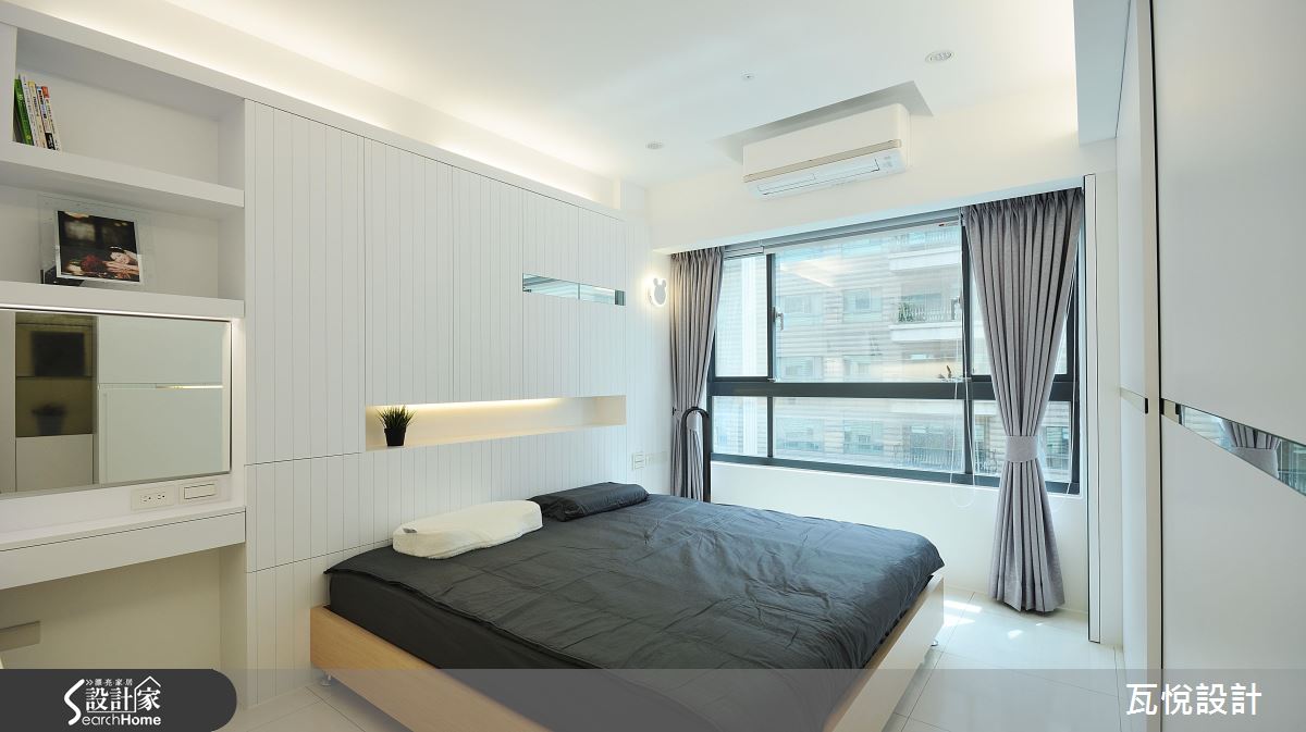 主臥以純白色調的大面積隱藏收納為主軸,並刻意預留天花與櫃體的空間,嵌上間接照明,為清爽空間的帶來暖感色調。