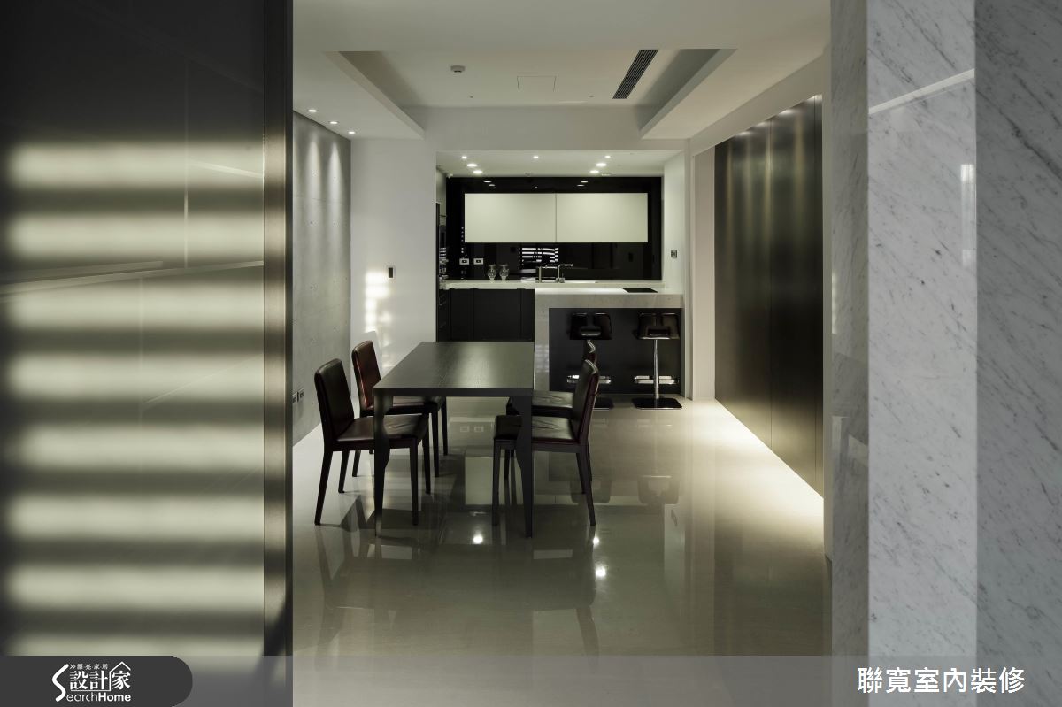 走進玄關,可見櫃面揮灑飽和而獨特的墨綠色澤,與灰色石材相互呼應,拉出視覺層次感;客廳天花、立面透過斜面處理與燈帶延伸,打造獨具一格的劇院風格調,且將屋主拍照用的棚燈改造為個性立燈,增添一抹暖光,同時保有乾淨俐落的牆面表情,做為屋主攝影作品的展示背景,搭襯明亮日光進駐,揭序自然有品味的生活風格,廳區後方則連結開放書房領域,藉由灰色玻璃拉門配置,讓場域充滿彈性可能,保有情感互動或獨立隱私;餐廳注入溫暖的燈光效果,營造溫馨愉悅的餐敍氛圍,並規劃一整面黑色鐵板,作為隨時更換展示照片的回憶牆,展示生活中的美好留影;進入主臥,於門口安置通透的機能塊體,網羅視覺屏蔽與收納衣櫃功能,並在床頭牆賦予木百葉窗設計,讓陽光自然流洩入室,鋪敘溫暖靜雅的寢居表情!