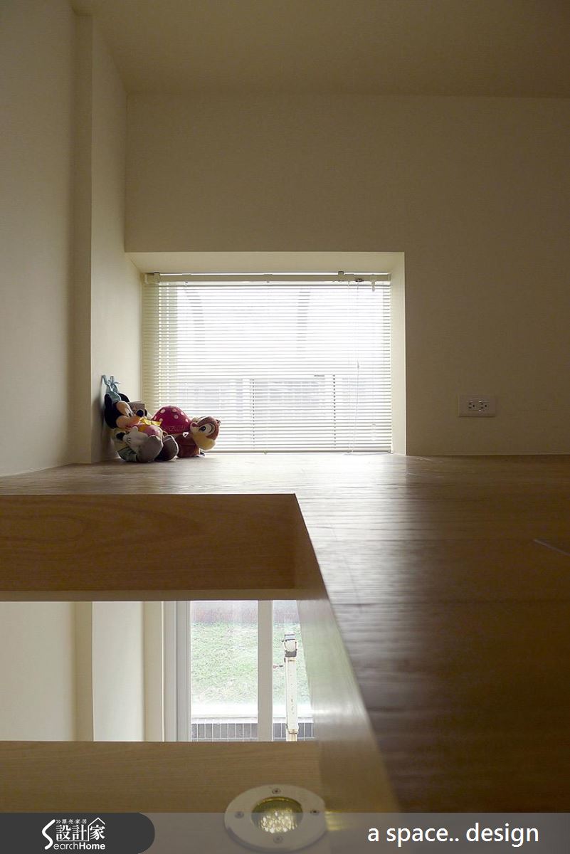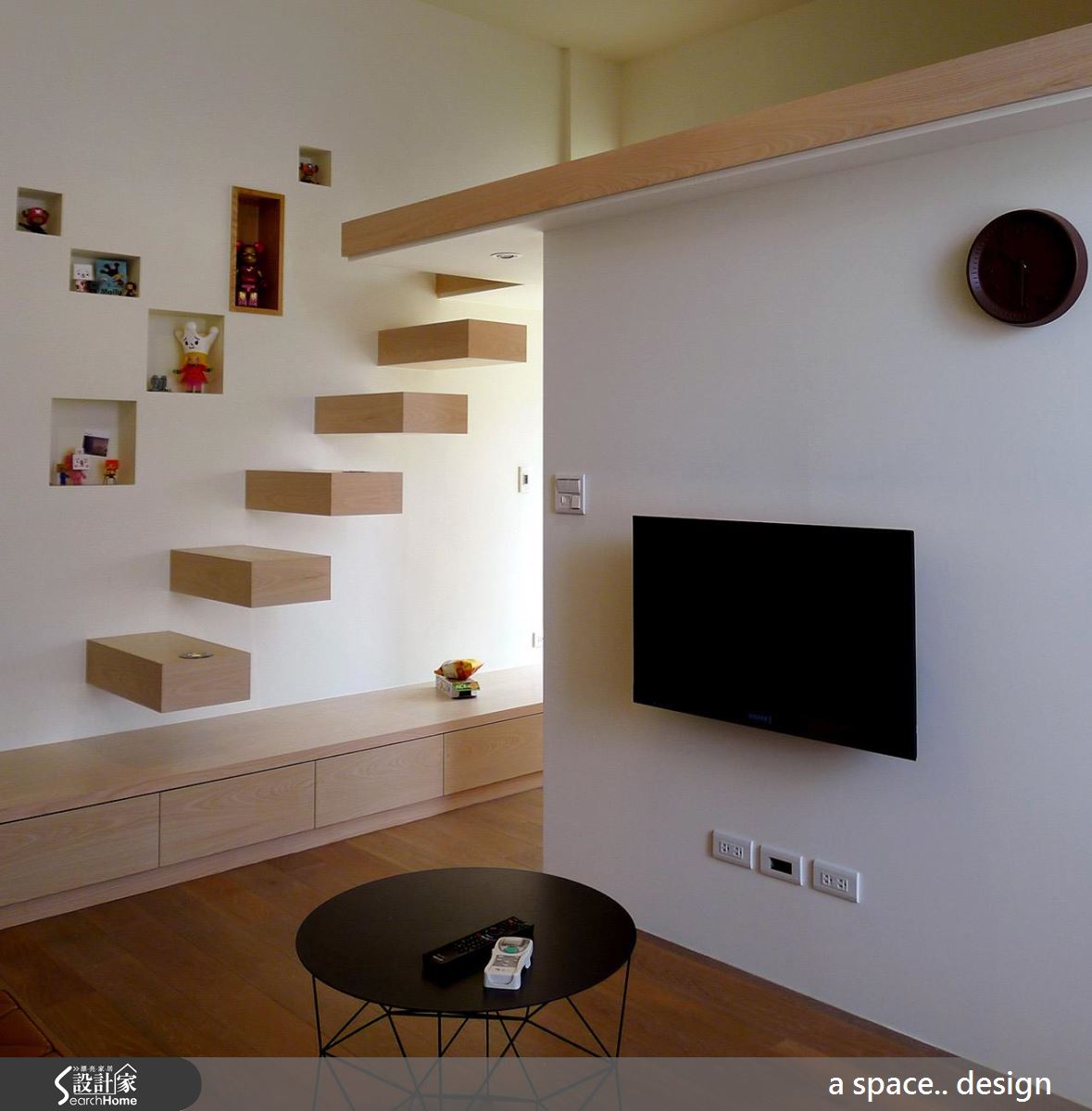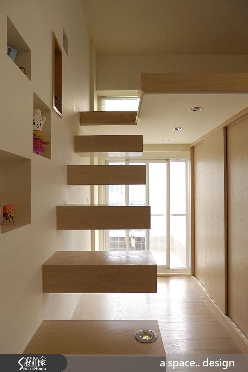 隨著階梯向上,樓梯旁的牆面打造出大小不同的收納展示格,放入日常喜愛的小物收藏,在簡約中點綴出活潑童趣的生活氛圍。