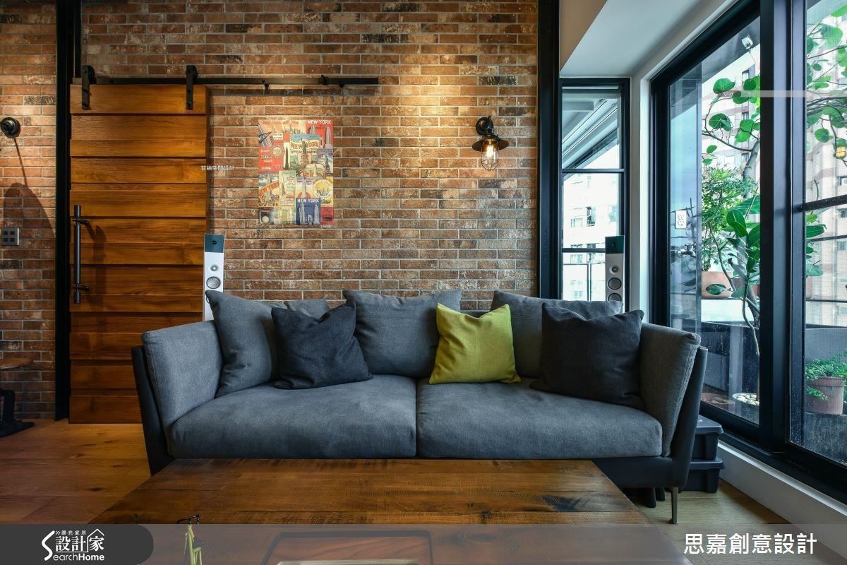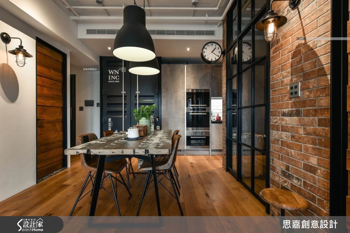 本案屋況先天採光良好,設計師將此優勢放大,將原先書房與客廳之間的隔間拆除,利用清玻璃與為媒介,讓光影自然灑入,延伸空間視感。沙發後方的文化石牆從客廳延伸、轉折到廚房,讓整體視覺呈現一致性。空間中使用 H 型鋼材、工業感的金屬吊燈、帶有木頭紋理的餐桌,裸露的手把與管線等,都在在演繹濃濃的 Loft 氣息。地面以溫潤的實木地板鋪陳,輔以大面落地窗,光與綠意從室外灑溢於內,為空間注入溫暖的居家視感。