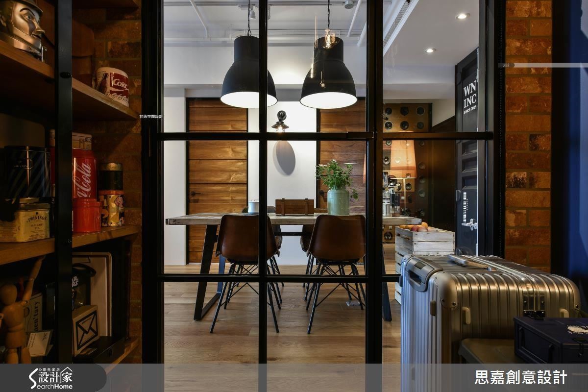 玄關處的造型牆風格強烈,設計師花費許多心思網羅了二手喇叭,將大小、色調顏色不一的喇叭拼貼於玄關牆面,產生不同層次的立面變化,又能兼具實用的櫃體功能,成為甫入內的一抹焦點。餐桌旁的造型貨櫃門,利用木作上漆再融入金屬元素,讓看似剛硬冷冽的櫃體散溢著些許溫潤。書房以深色調牆面為基底,鐵件與木層板構築的書架、配搭 Loft 風的家飾品,營造風格強烈的空間氛圍。