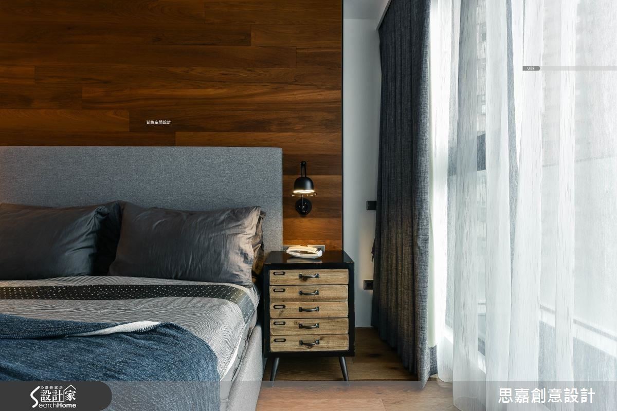 面對各有風格喜好的男女主人,詹智翔設計師將私密的主臥區留給女主人。有別於公領域呈現強烈的 Loft 視感,主臥延續工業風格的餘韻,卻利用材質的調和與轉換、軟件家俱的配搭,例如實木拼貼的床頭主牆、乾淨俐落的空間線條,呈現簡純溫暖的眠臥氣息。