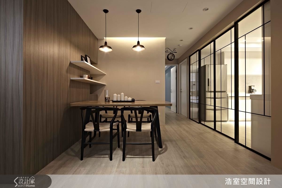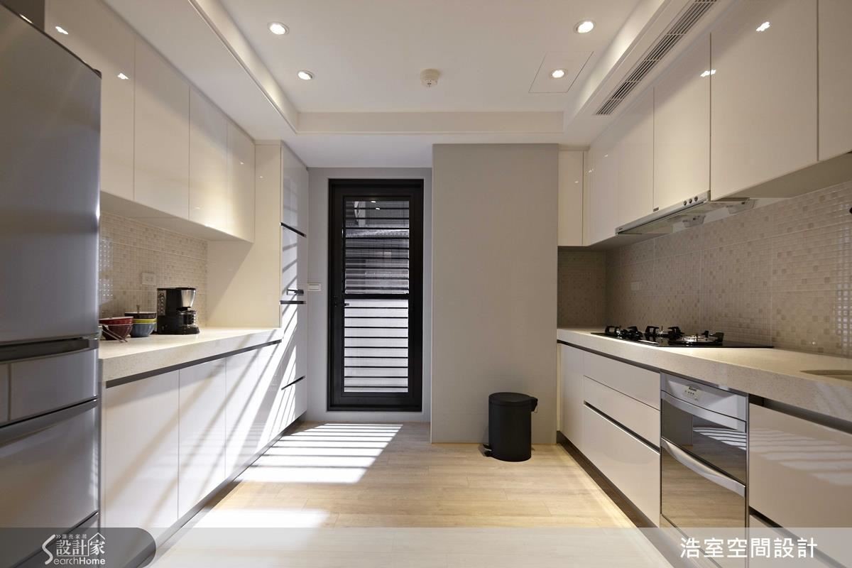 業主希望在廚房裝設冷氣,加上空間的需要,浩室團隊利用玻璃與鐵件為原本開放式的廚房,做出清透的玻璃拉門,成為增設的「隔間牆」。冷氣的出風口位於右側烹調區塊上方,讓主人在料理時不必汗水淋漓,而玻璃拉門既不會影響光線的流通,又能在開冷氣時防止冷氣外洩,也可以隔絕油煙。