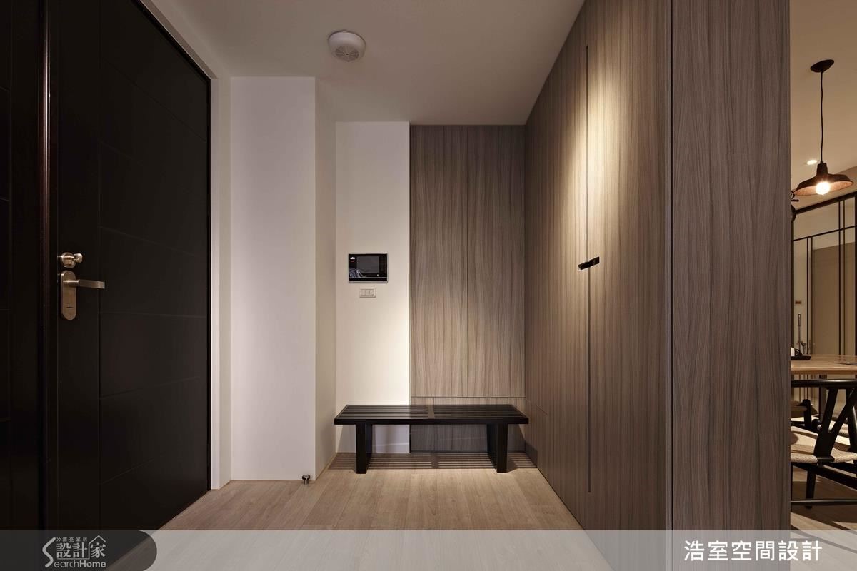 其實為了讓訪客不要一進大門就看到主臥室的房間門,浩室團隊在原本客廳的牆面上運用巧思,以厚厚塗層刷滿整面牆,再把房門隱藏在牆面裡,也有加大客廳空間的效果。