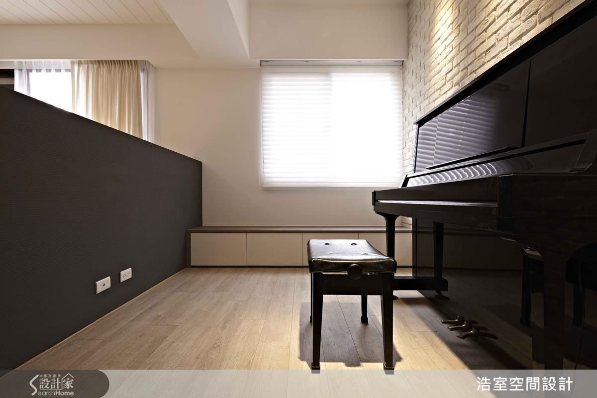 在這個 45 坪的新成屋裡,浩室空間設計團隊在原本開放式的空間裡增設 3 面牆,第1面是利用頂天立地的雙面超大收納櫃,隔出玄關及餐廳空間;第 2 面是客廳的半高電視牆,區分琴房以及客廳的使用範圍;至於第 3 面牆,則是在開放式的廚房做出玻璃拉門,不會影響視覺及光線的穿透,卻擁有隔絕油煙及節能的超強機能,還能靈活開關。