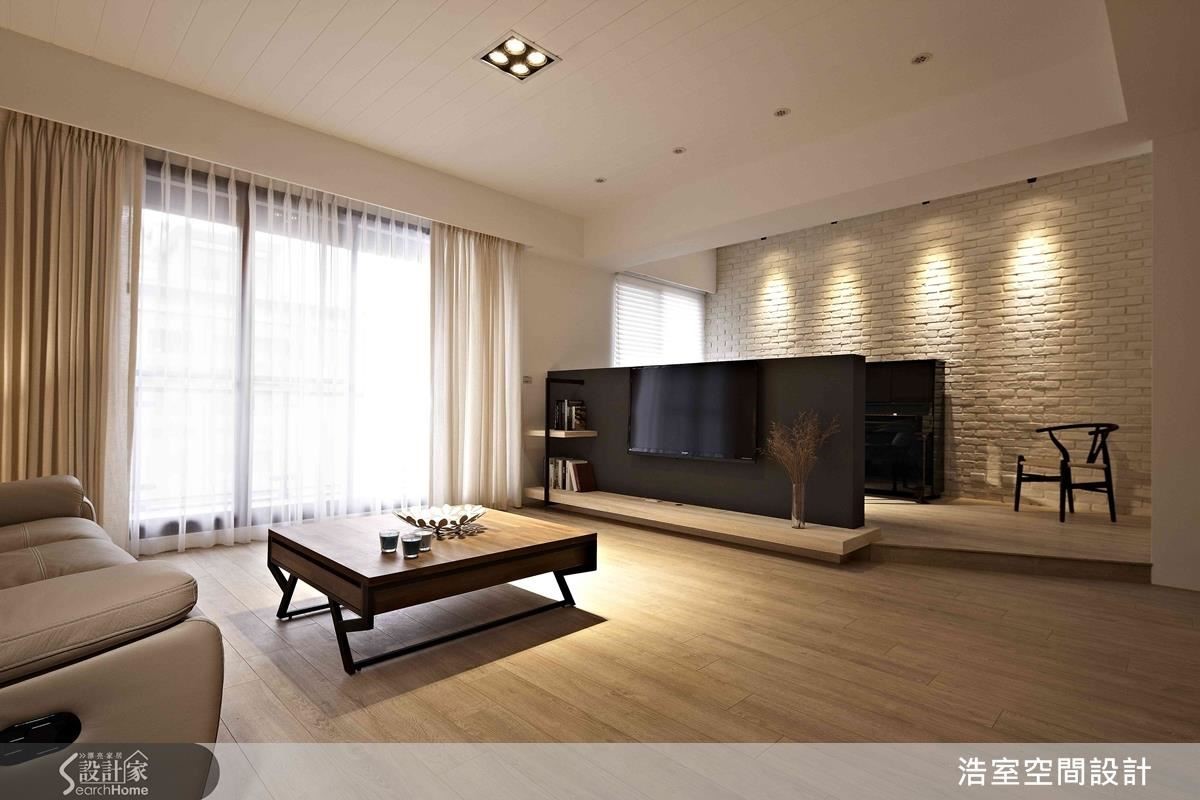 寬敞的客廳利用架高的地板、半高的電視牆隔出琴房,斜角的入口設計增添空間趣味,也順利導引動線(上圖)。特別的是,電視牆以木作塗上可以調節濕度的珪藻土,以保護鋼琴所需要的濕度(下圖);而牆面採用色粉調製出特別的鐵灰色穩住空間氛圍,木作的檯面在靠窗處配合鐵件做出具有設計感的開放層架,簡單又大方。