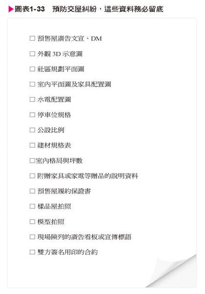 當然,買預售屋最擔心的問題,就是如何確保建築品質跟當初說的一樣好。為了保障購屋權益,買預售屋絕對不能偷懶,並遵守「處處留底、時時監工」的原則。亦即拿一個資料袋,從拿到第一份廣告、建商提供的外觀 3D 示意圖,到平面設計圖、樣品屋照片、建材設備資料、停車位規格等,都要連同合約書一起保存,因為這些都可視為是契約的一部分,一旦建商虛灌坪數、偷工減料,這些資料都是未來可以幫你討公道的證據。