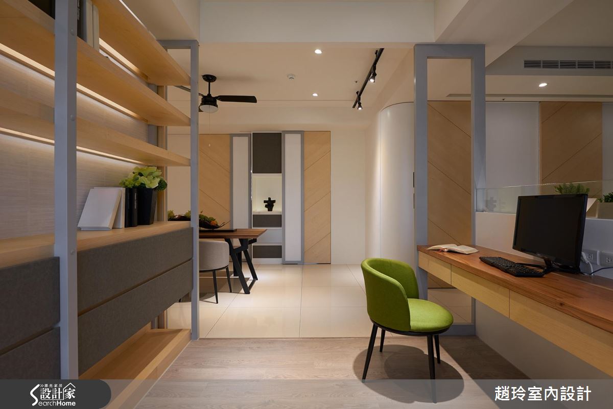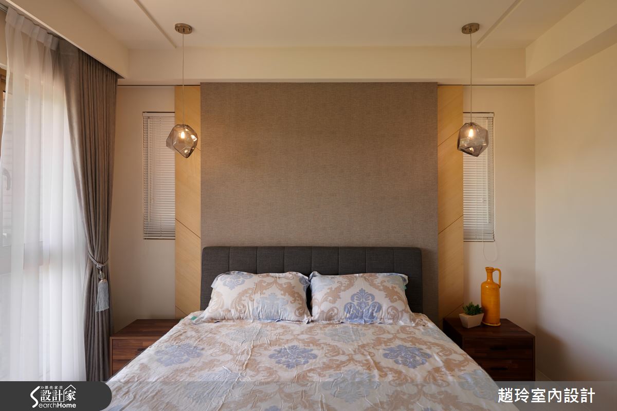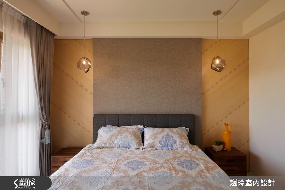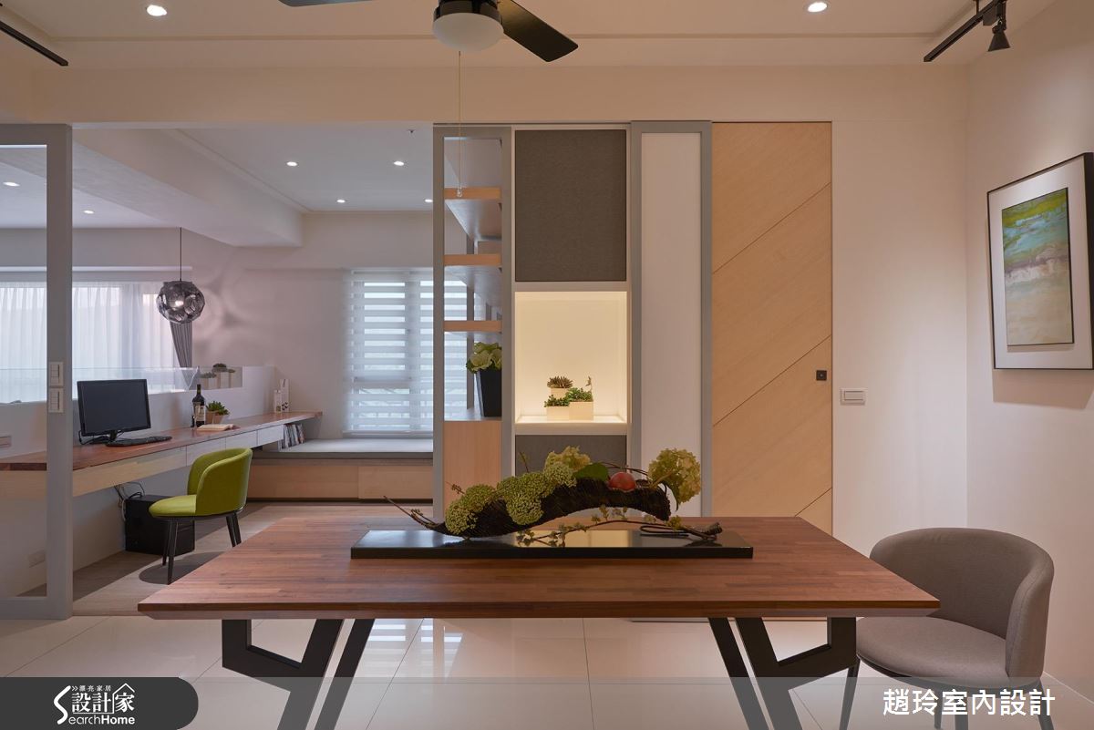 客廳、書房、餐廳等主要空間,減輕了實體隔間的負擔,採取半開放式設計,讓彼此相互連結成一個寬敞大空間,將坪效優勢發揮到最大,在不同的領域都能感受舒適空間感。因應原有的屋高不高及樑體位置,設計師以具斜度的天花設計敞開空間尺度,呼應斜紋木質拼法、電視牆的橫向石質紋理,創造出細緻的質感變化。餐廳處的櫃體展示,改為透光石取代一般的嵌燈打光,更加凸顯溫和、均衡的光影感受。私領域利用灰色皮革裝飾床頭背牆,而兩側的斜紋木皮不只是風格造型營造,也可以視需求開闔,讓後方隱藏的小窗為睡眠區帶來更充裕的日光。