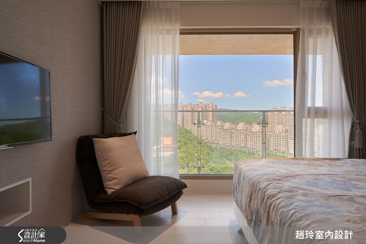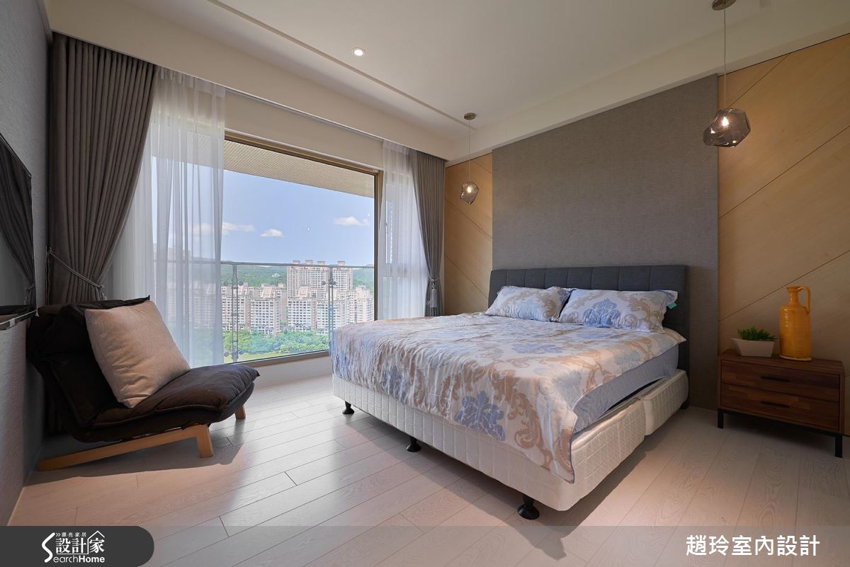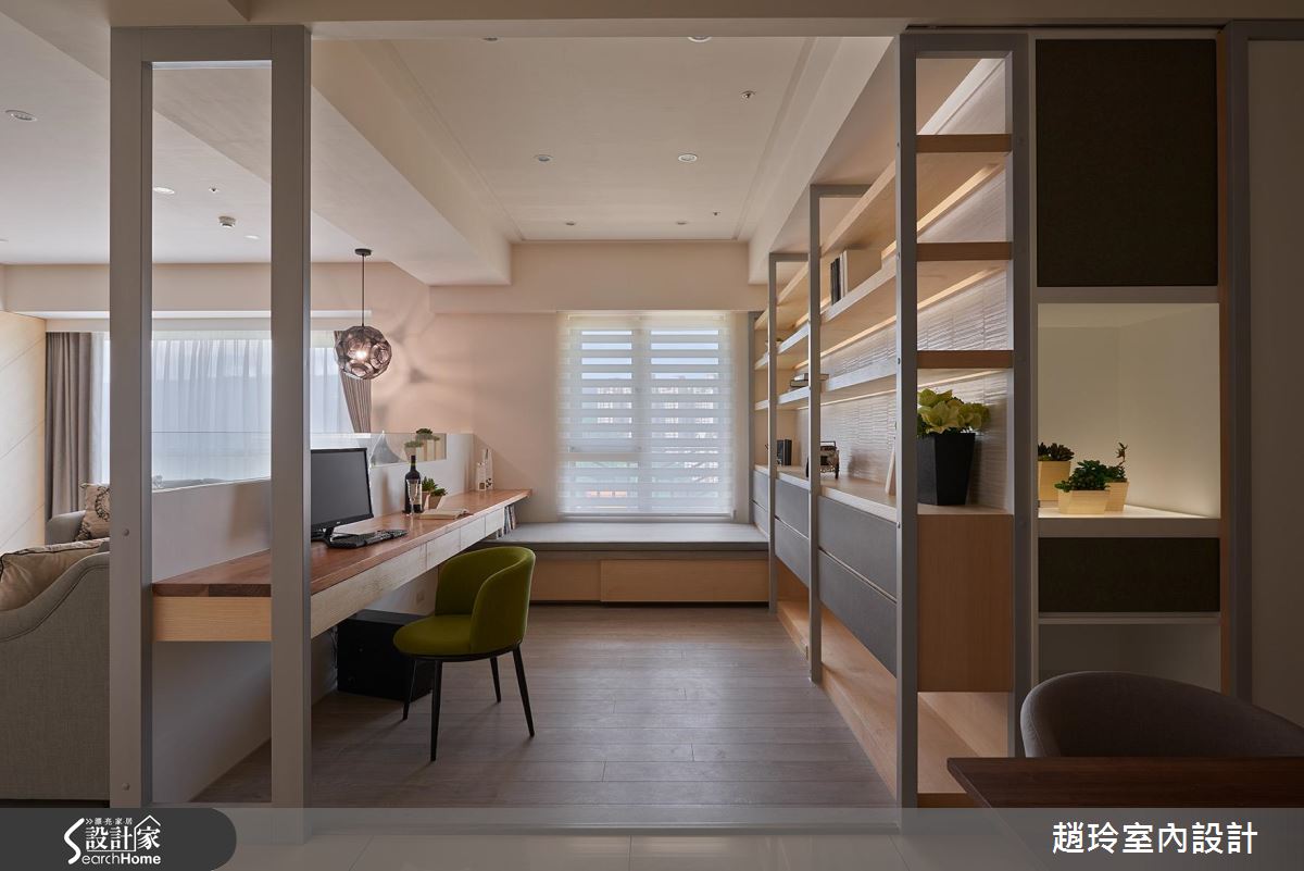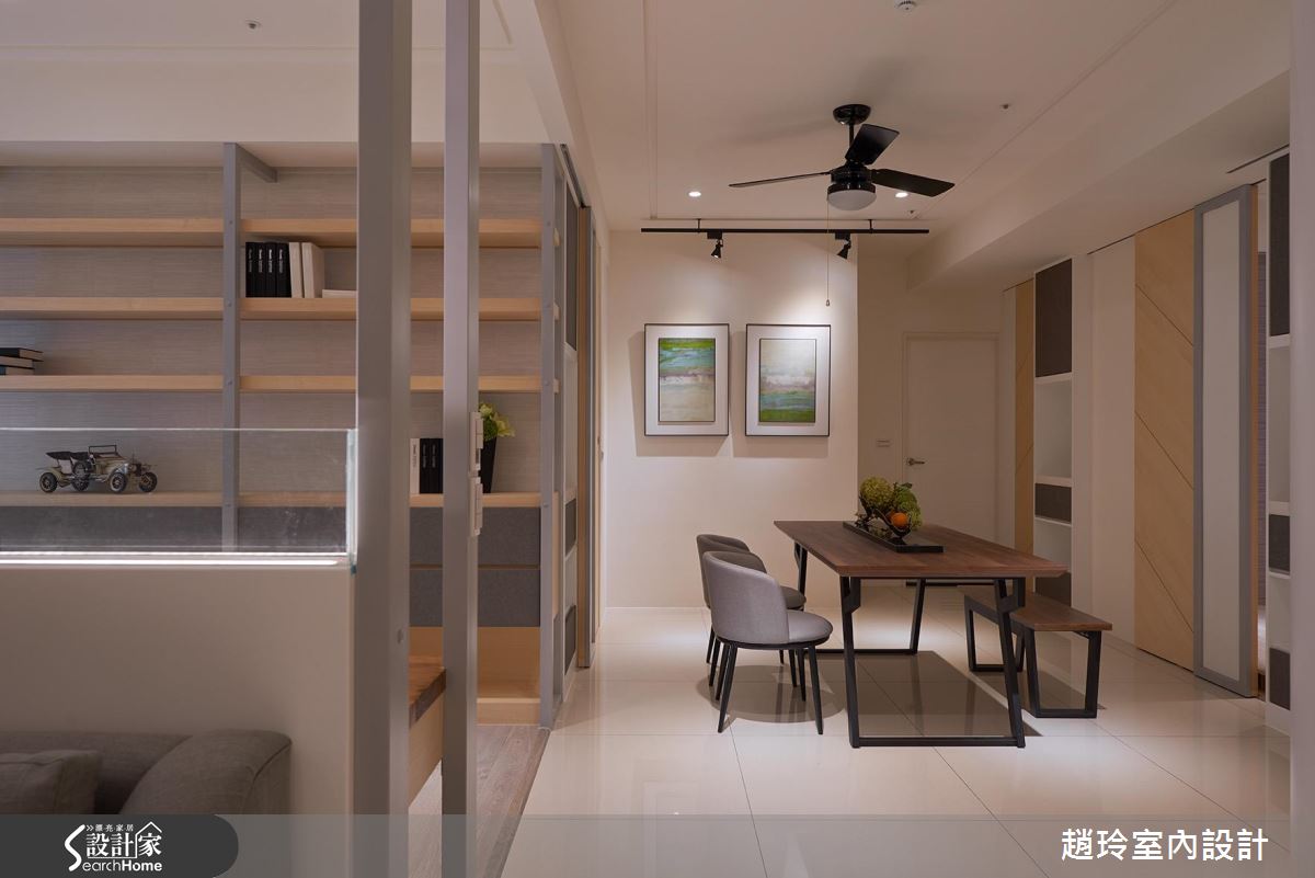 客廳、書房、餐廳等主要空間,減輕了實體隔間的負擔,採取半開放式設計,讓彼此相互連結成一個寬敞大空間,將坪效優勢發揮到最大,在不同的領域都能感受舒適空間感。因應原有的屋高不高及樑體位置,設計師以具斜度的天花設計敞開空間尺度,呼應斜紋木質拼法、電視牆的橫向石質紋理,創造出細緻的質感變化。餐廳處的櫃體展示,改為透光石取代一般的嵌燈打光,更加凸顯溫和、均衡的光影感受。私領域利用灰色皮革裝飾床頭背牆,而兩側的斜紋木皮不只是風格造型營造,也可以視需求開闔,讓後方隱藏的小窗為睡眠區帶來更充裕的日光。
