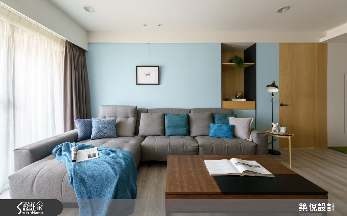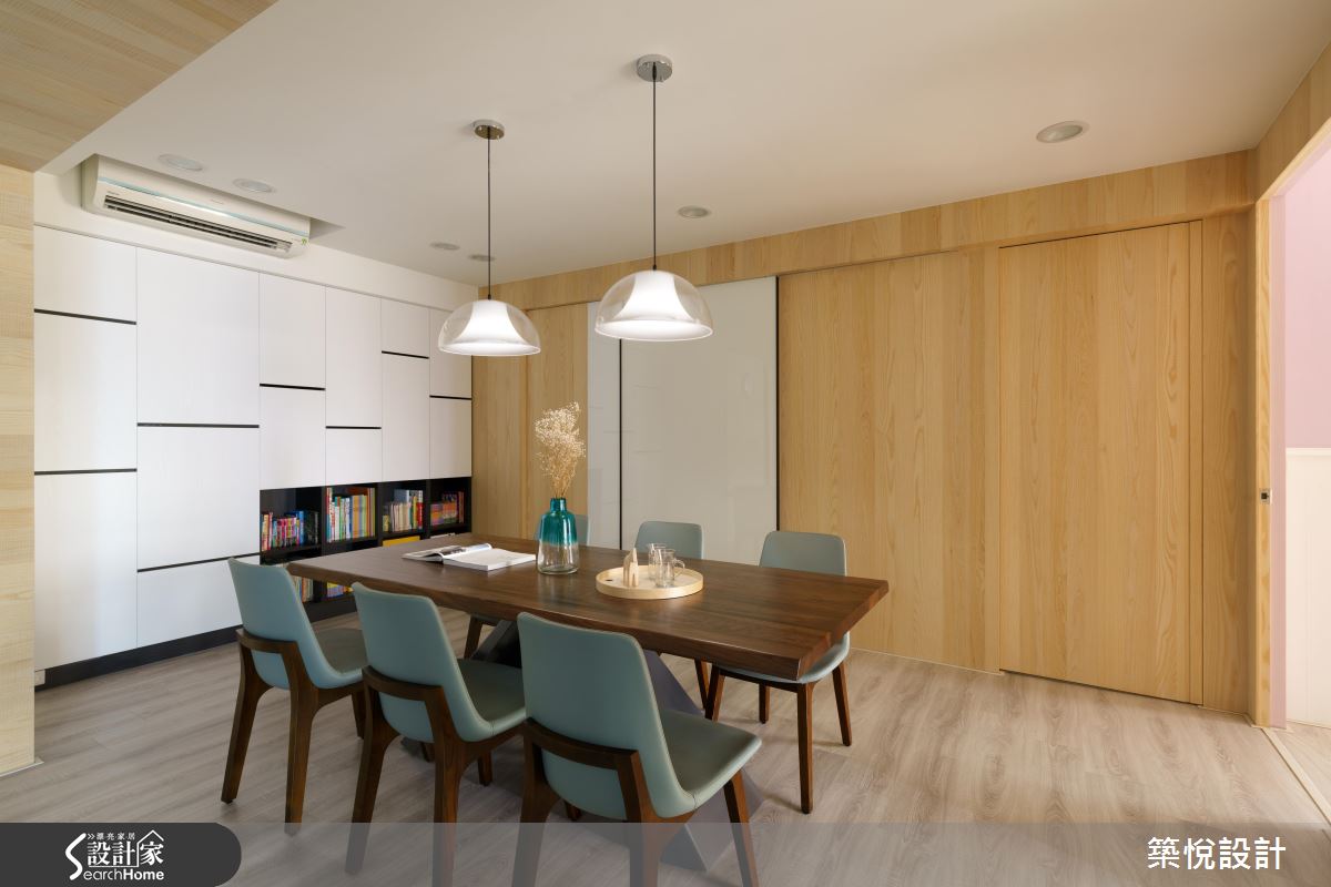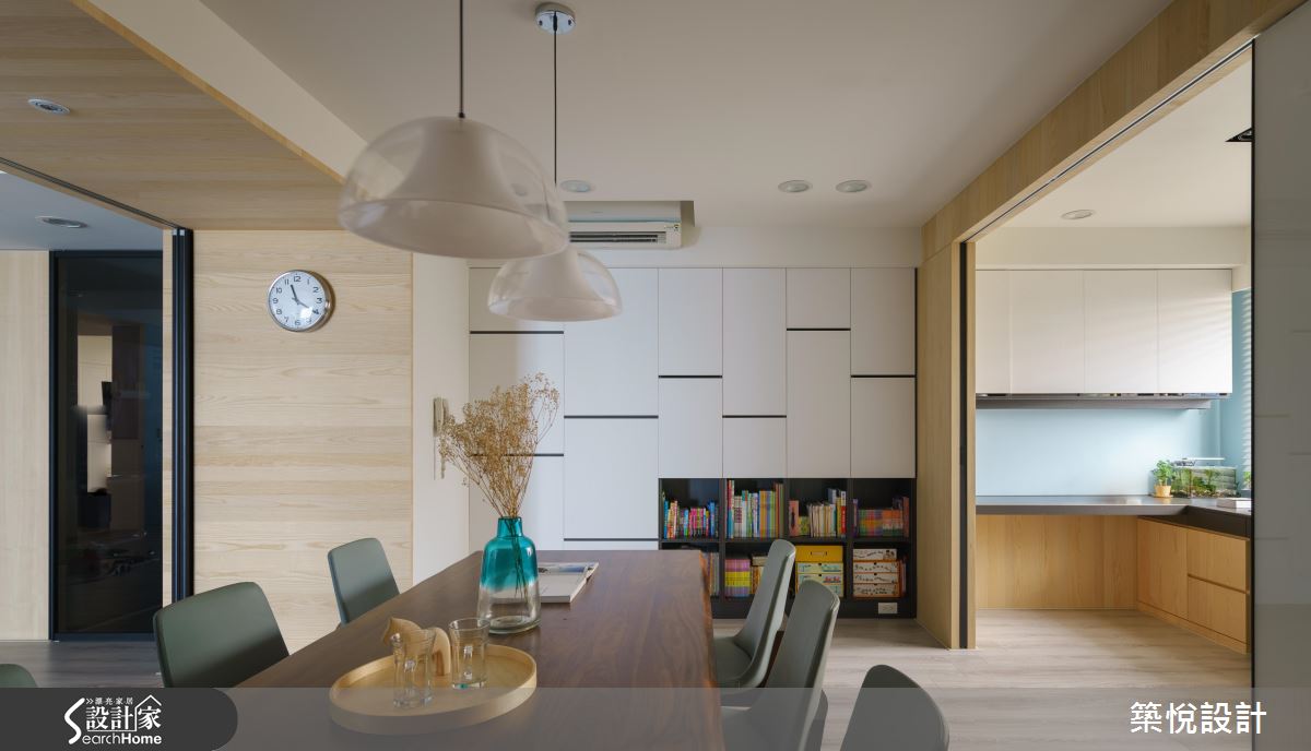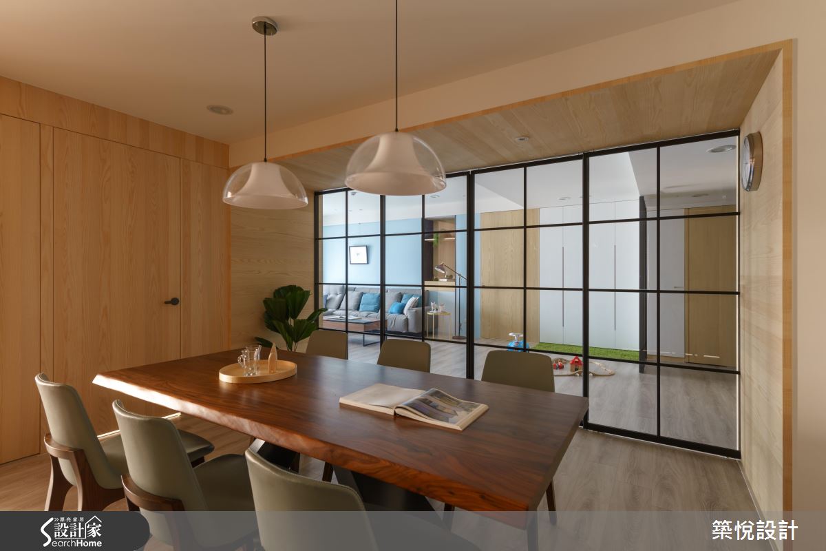 設計師看見格局與採光優勢,並配合親子空間需求,以木質與鐵件玻璃拉門取代公領域部分牆面,可隨心創造流暢、無礙彈性空間。玄關以透光屏隔抹除穿堂煞疑慮,將通往主臥的木質門片作為及頂收納櫃與水藍客廳背牆的串連,利用建材與色調的融合營造視覺豐富度。石作質感的電視牆,與純白色機櫃及色調輕淺的木地板形成清爽卻不顯冷冽的組合。由客廳向內延伸,為相連的餐廳與書房,三個領域可互相獨立或相通,讓孩子的遊戲空間無限延展。