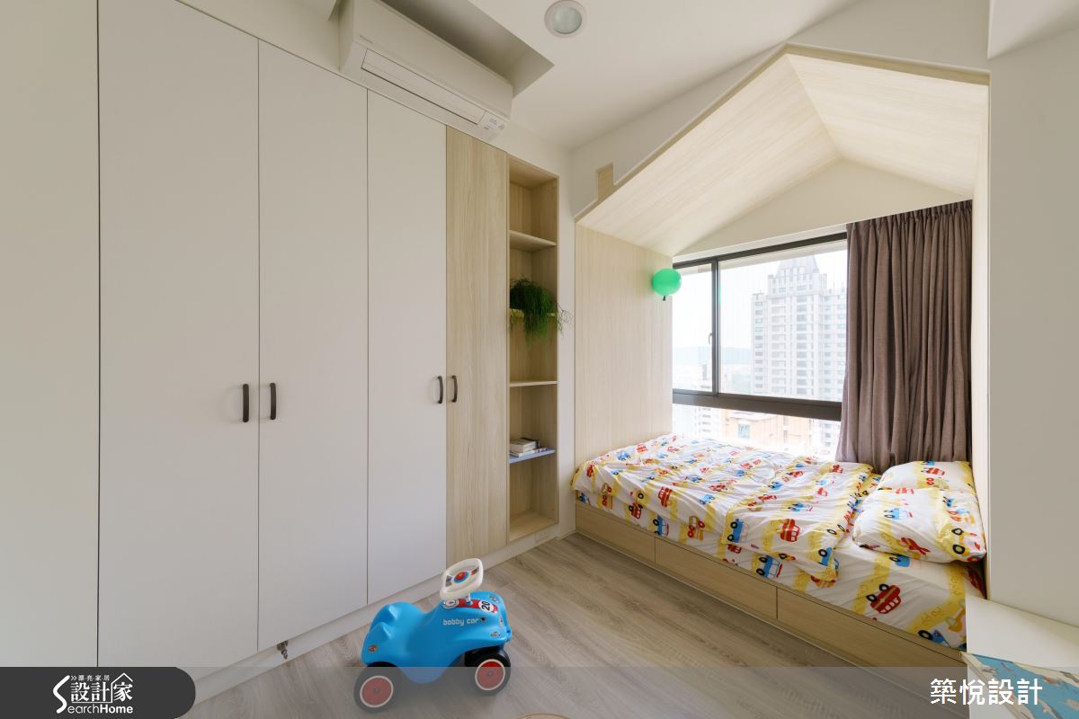 兒童房兼具實用與美觀,設計師設計大面積櫃體,讓孩子大量的所需物品得以完整收納;另外更利用木作打造尖頂木屋造型搭配氣球燈,注入滿滿童趣!