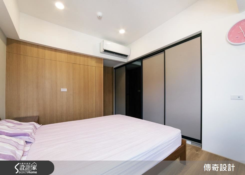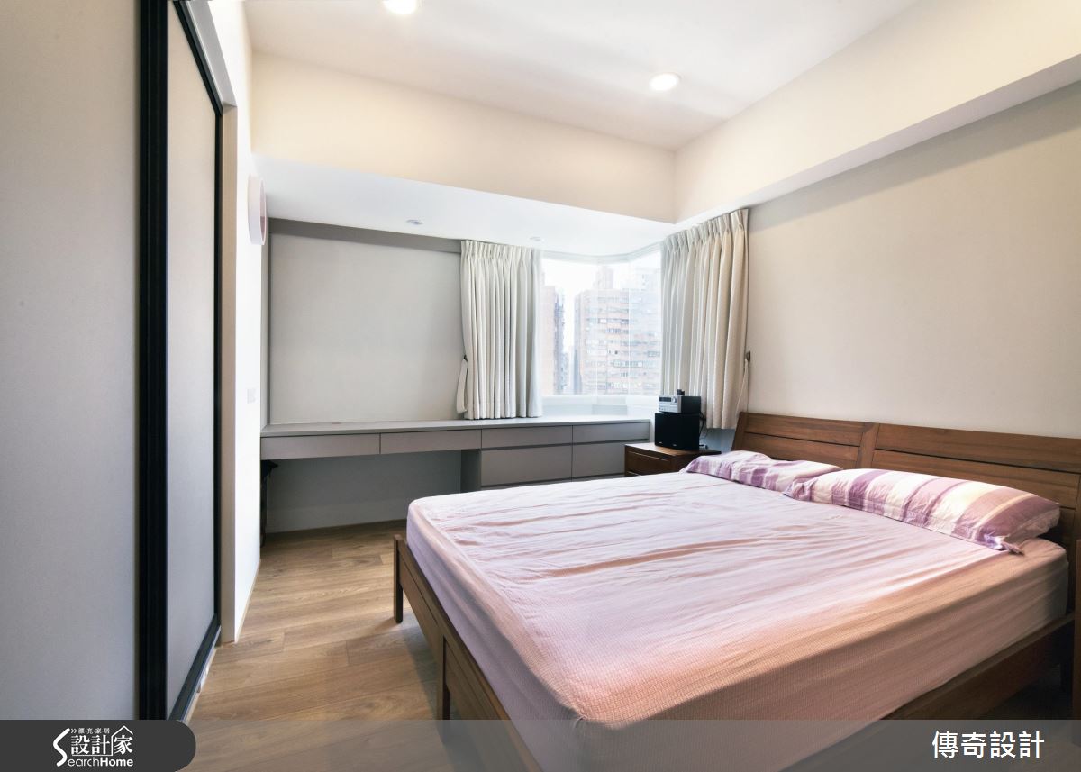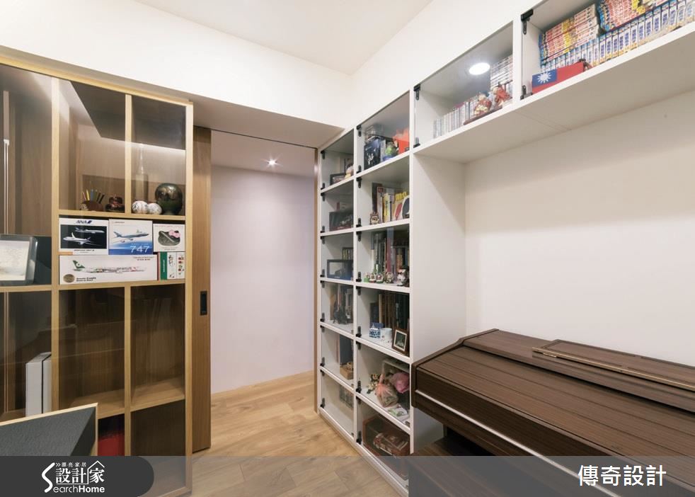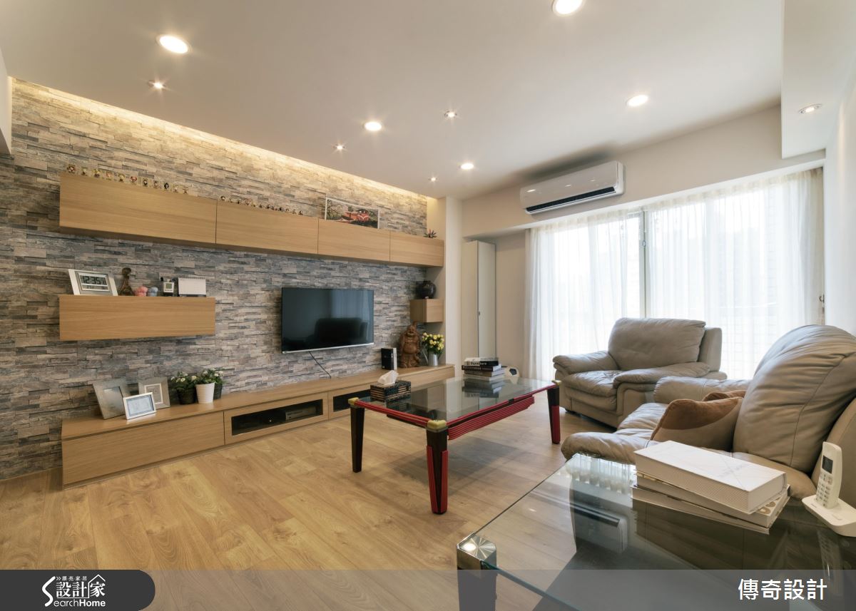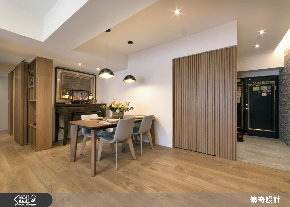 公共場域呈開放規劃,藉由大面落地窗導入美好陽光,採用超耐磨木地板鋪述整體,呈現溫潤氣場,電視牆則選用日本進口石紋壁紙為背景,透過視聽櫃型塑延伸線條,拓大立面視覺尺度,並考量到格局天花較低,融入間接燈光與嵌燈拉抬空間感;餐廳則與神龕做出融合,一旁牆面飾以木作線性語彙,巧妙將門片線條予以掩飾,在一致的色調中勾勒協調畫面;男主人因常年蒐集的模型無處擺放,於是特別隔出書房,引用大量的層架安排,替這些家飾品找到好去處;主臥房賦予充裕的櫃體配置,並將梳妝檯安置在窗邊採光絕佳處,強調生活機能的實用性,同時延續溫潤的木質調,刻劃紓壓宜人的氣氛!