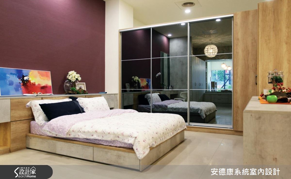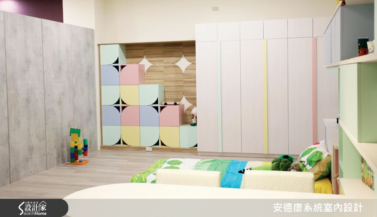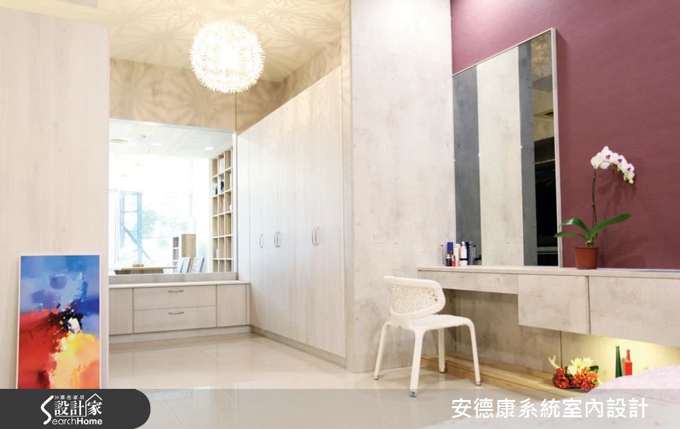 空間整體以家為概念,於客廳電視主牆嵌製展示櫃,透過錯落的趣味組構形式,使量體有如步步高升的棋格,拓大並豐富立面表情,並與茶几、沙發椅等展開建材肌理的混搭,集美觀、收納與擺飾功能於一身,演繹獨樹一格的場域面貌;同時將櫃體作為隔間與動線導引,像是餐廳旁即規劃雙面開放式櫃體,使空間可與外部有所對話,不但讓視線更加延展,亦達到展示與收納作用;主臥衣櫃採以黑晶面體製成推拉門,安全性高、滑順度佳,並創造延伸視覺,床板、床箱與床頭櫃等則皆可量身客製,搭配床頭背牆的紫色壁紙,勾勒舒適且具質感的休憩天地;更衣室呈現ㄇ字格局,配上門片高櫃、抽屜矮櫃,和開放式層架設計,搭佐造型燈飾的聚焦點綴,譜出典雅簡約的氣質;小孩房櫃體以圓弧裁切造型取代尖銳款式,襯上清爽淡雅的色板配色,不僅大幅提升安全性,也增添量體的活潑與變化性!