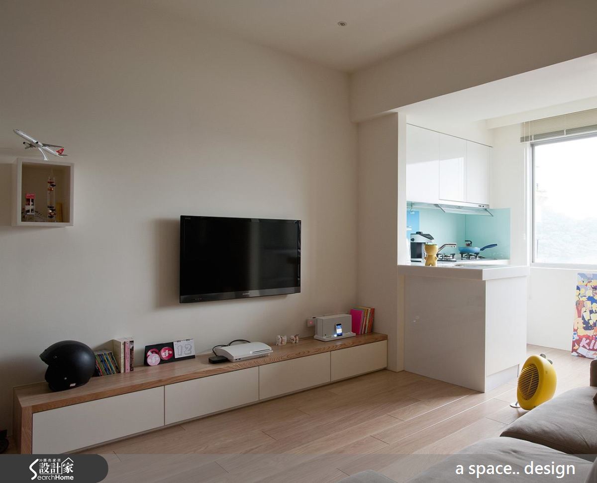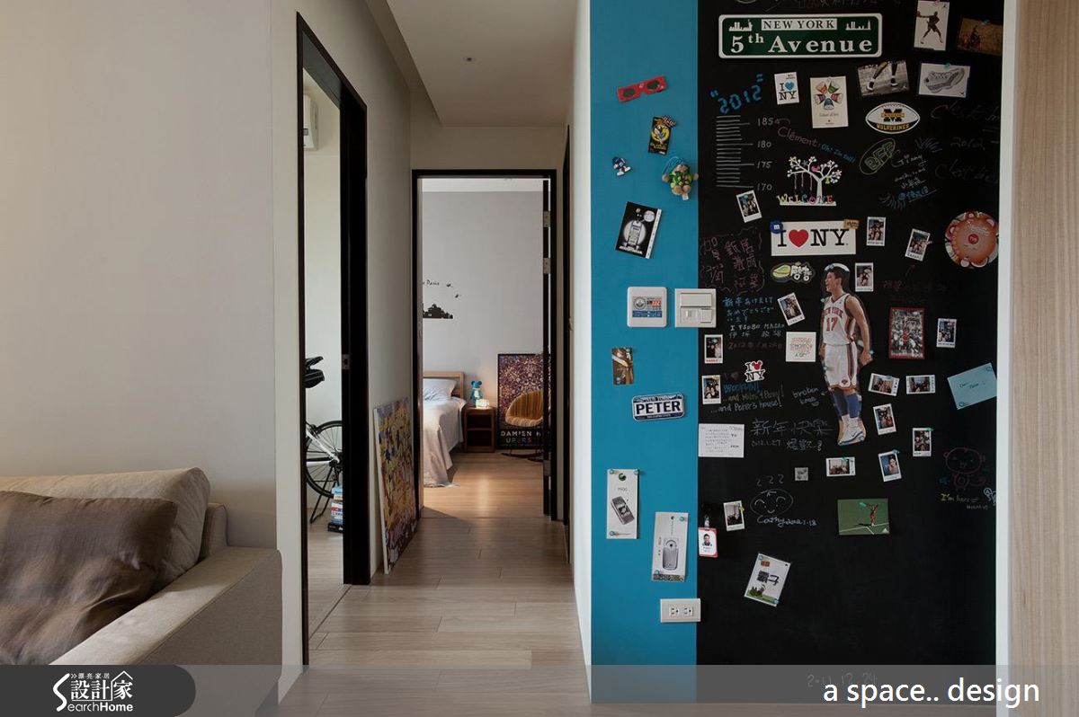 全室引用木地板鋪陳,表現舒適悠閒的氣場,並於電視牆嵌上錯落的開放格櫃,擺上公仔與收藏物展示,記錄回憶及情感點滴,同時在一旁立面加入色塊、建構黑板牆,融入塗鴉和照片的創意點綴,型構視覺焦點,沙發背牆則鋪陳淺灰色,與整體白調作出層次差異,提升室內整體的溫度;格局上,讓沙發背牆局部鏤空、加入清玻建材,使廳區、書房產生微妙的視線連結,一旁則把廚房安置在採光絕佳處,可享用美好充裕的日光,且拆除封閉隔間、賦予開放式規劃,與客廳場域產生交集互動;臥室藉由壁貼、家具的安排,並揉入木紋細膩肌理,描繪出屬於居住者的個性品味!