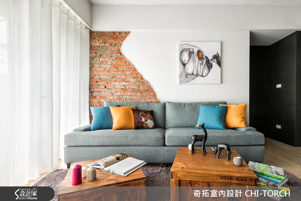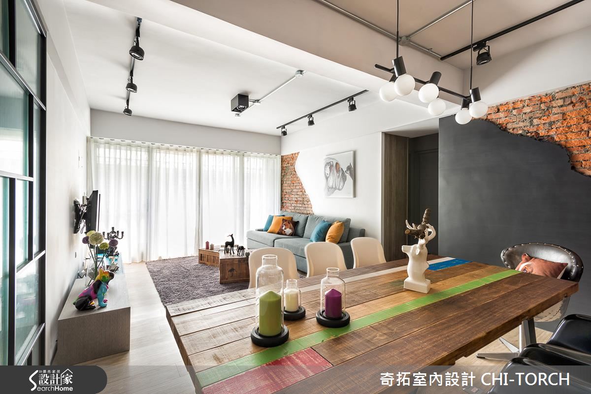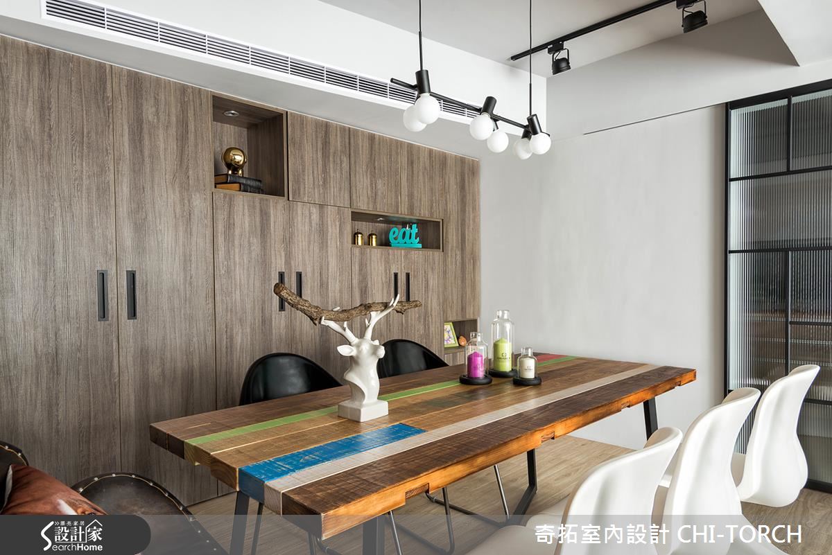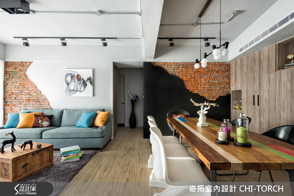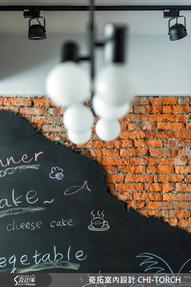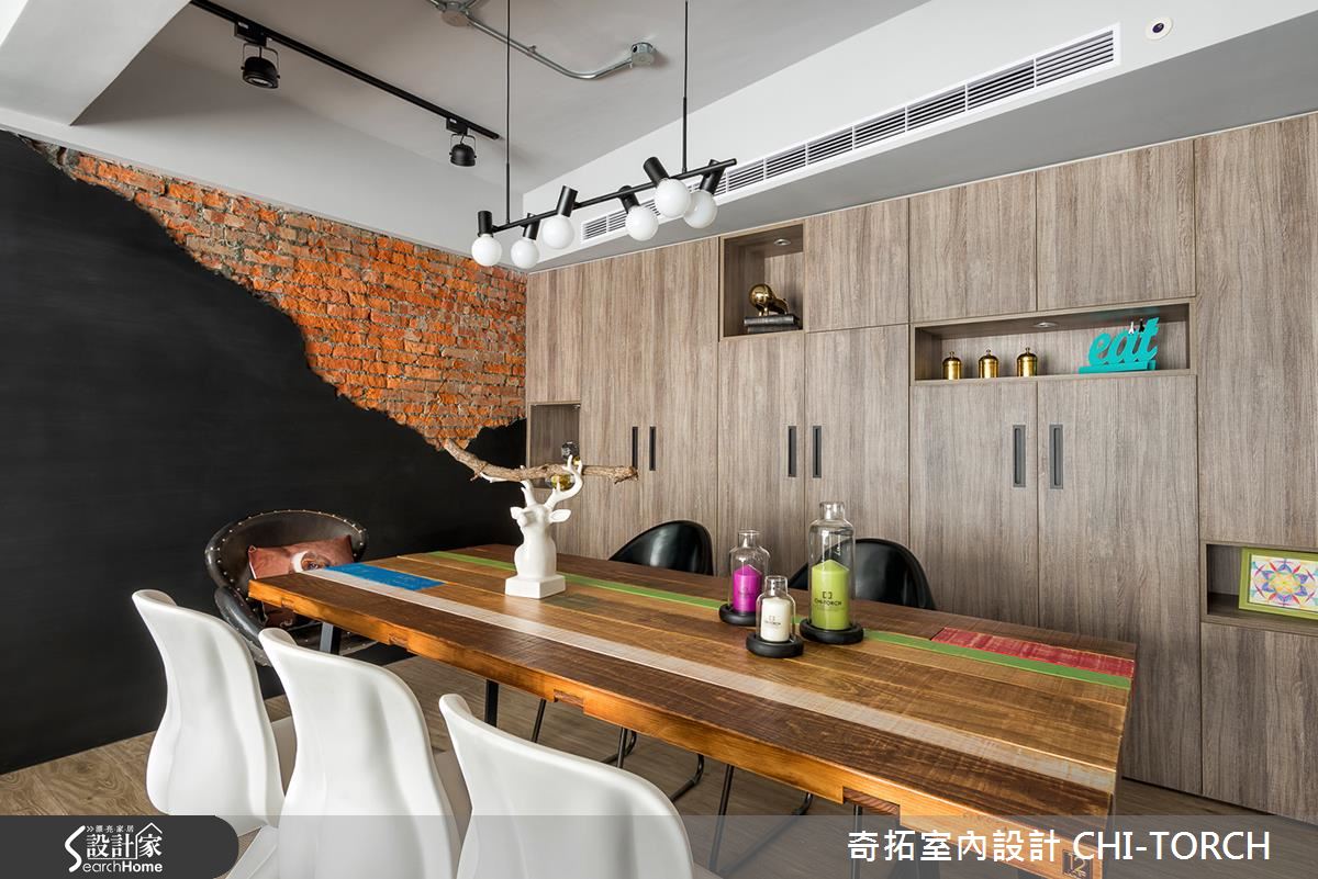 設計師首先穩固基礎,做好外牆防水並依序解決老屋問題,接著依據女主人私廚工作需求,重新定義格局分野,清楚在 25 坪空間內劃分公私領域,使住宅兼具商業空間功能。設計團隊釋放代表老屋靈魂的紅磚牆面,佐以黑板漆牆面,帶出鮮明獨特的視覺端景。針對風格營造,設計團隊利用回收舊木製成長桌,搭配趣味性十足的設計餐椅,產生衝突美感;而作為桌几的木箱與波浪鐵件玻璃門更點出了復古細節,讓新舊氛圍完美交融。為了拓增收納機能,在餐桌後方加入大面積木紋櫃體,同時滿足工作與私用需求。