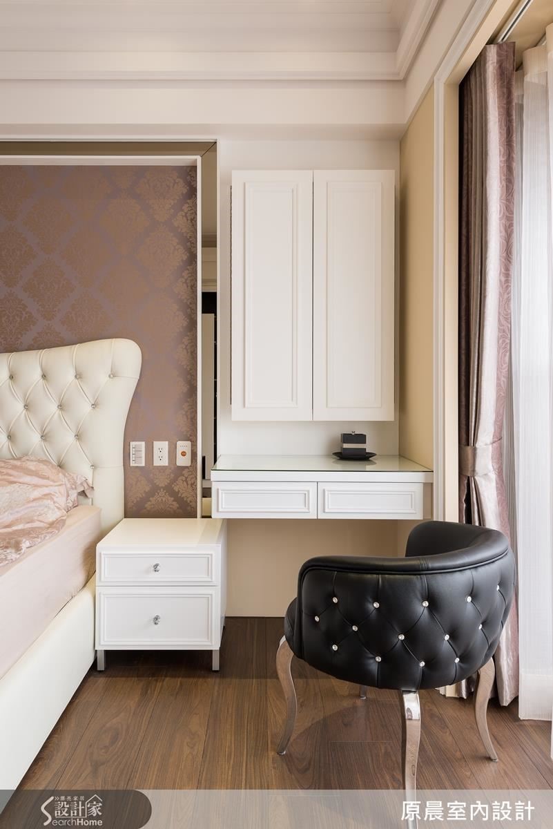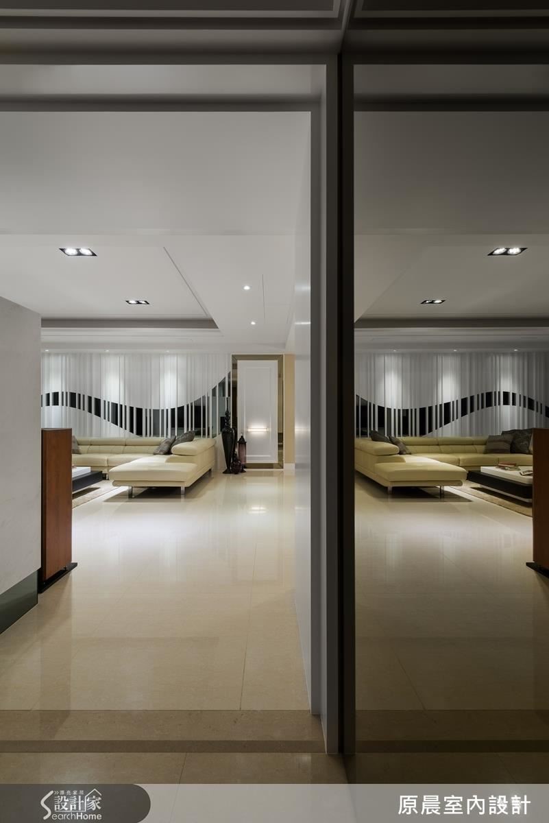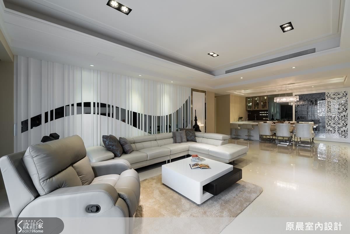 有鑑於業主夫妻對風格的想法不同,原晨設計以「現代風」與「輕古典」為主幹,避免過度奢華或繁複的意象在空間延展,改於門片、邊框、天花板等處綴以素雅中見層次的線板裝飾,沙發主牆面設計以俐落的線條分割與線板搭配造型,深獲業主喜愛。