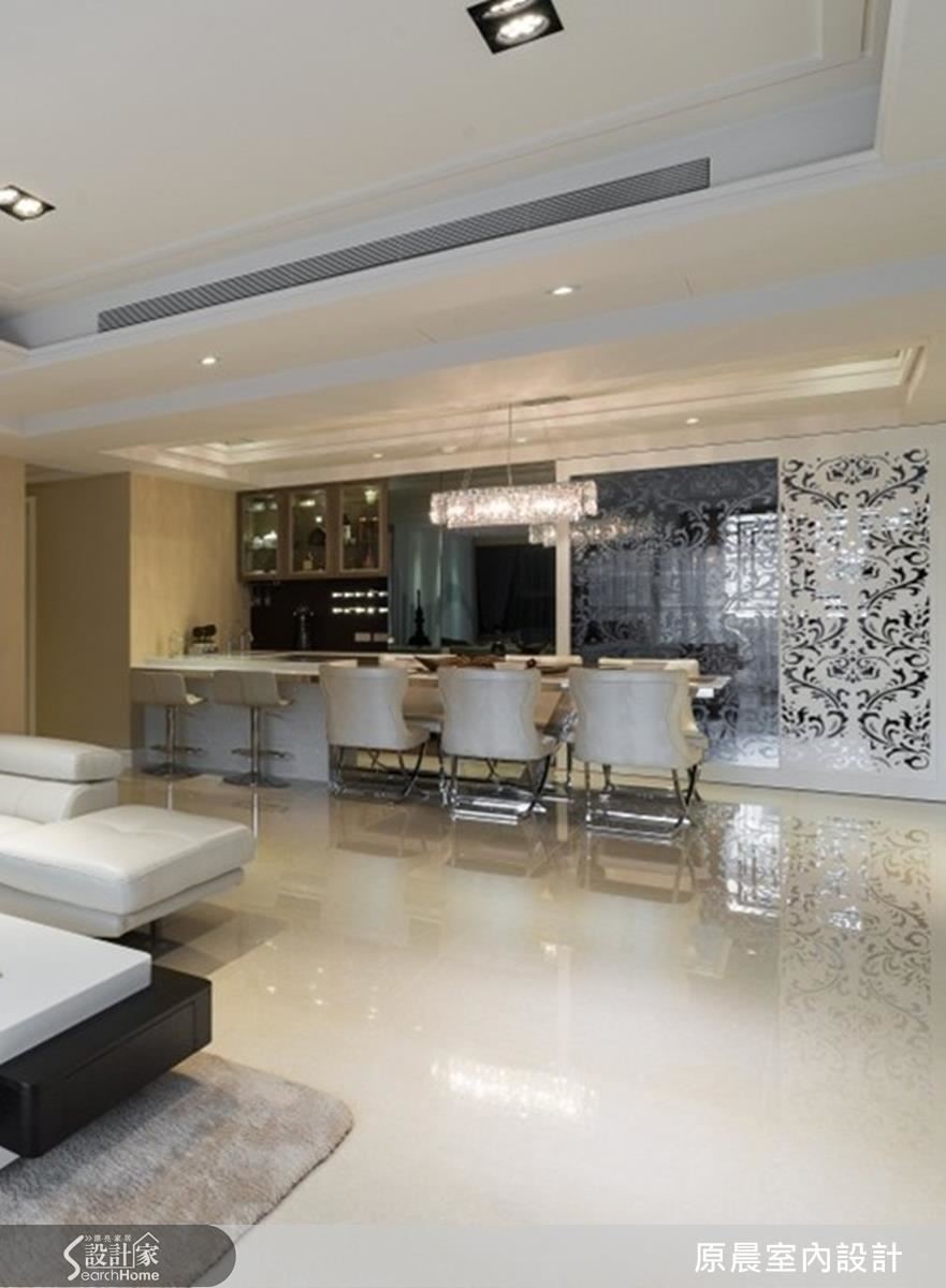 廚房與餐廳是女業主停留時間較長的公共區域,為帶出女業主喜愛的新古典低調華麗,除了餐桌上方的水晶吊燈外,廚房門片灰鏡上的噴砂紙,原晨設計改以古典雷射雕花製成,無論開闔皆保有公領域的穿透感,同時可隨燈光方向投射光影在客廳或是廚房走道上,美不勝收,內斂且細膩的闡述華美丰姿。