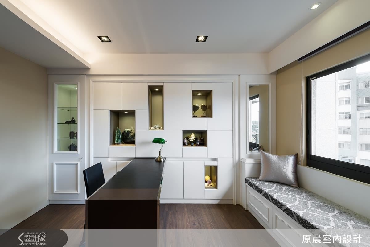 由於業主一家人口簡單,原晨設計建議屋主將原本四房格局改為三房,其中一房則打開部分隔間改為書房兼客房,半開放式作法除了穿透性提高,能有效擴大公領域範圍外,也可讓緊鄰公領域的房間在平日徹底融入公共空間規劃運用,三片折門的入口設計可以完全敞開,在公私領域分界上更能完整區隔。