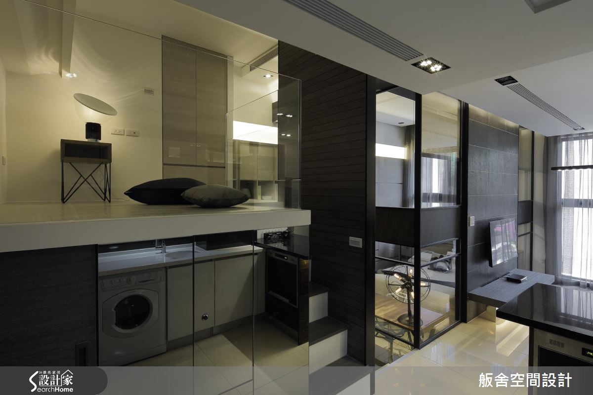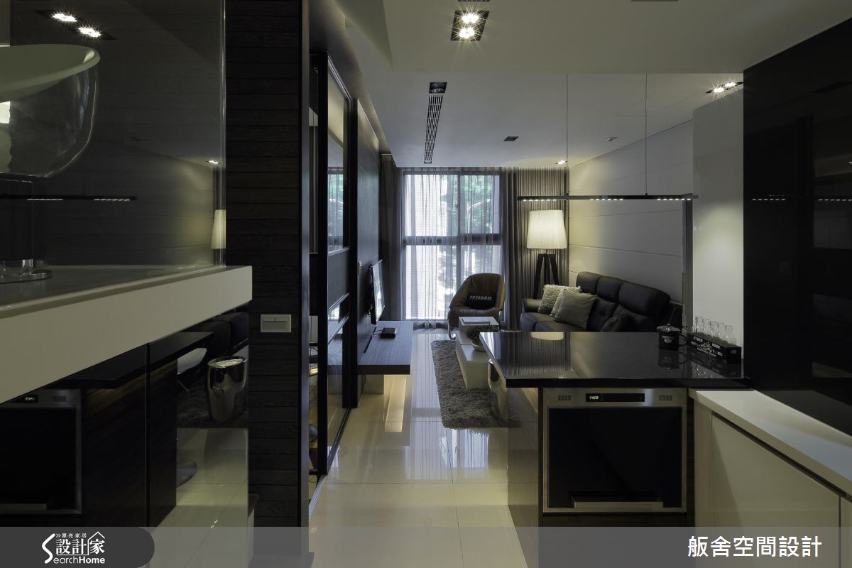 居宅內,設計師巧妙運用量體堆疊,創造領域範圍的差異,或於客廳、主臥之間融入地坪高低差,創造動線豐富性,住宅中央則配置中島吧檯,作出長型場域的層次段落;在材質使用上,則型塑沉穩極簡的現代低奢風格,利用深色鏡面材質延展景深、創造深邃質地,在水平結構中展現開闊視感,客廳、主臥之間加入板岩磚結合清玻璃,無形中刻劃通透的視線連結,並在臥房內配置書桌與書櫃,整合睡眠、書房功能,替小空間創造更豐富的生活機能,而書櫃則開放地面朝動線開口,構成自然而美好的端景,在格局、材質與動線的完美演繹下,描繪出精品小豪宅的質感生活!