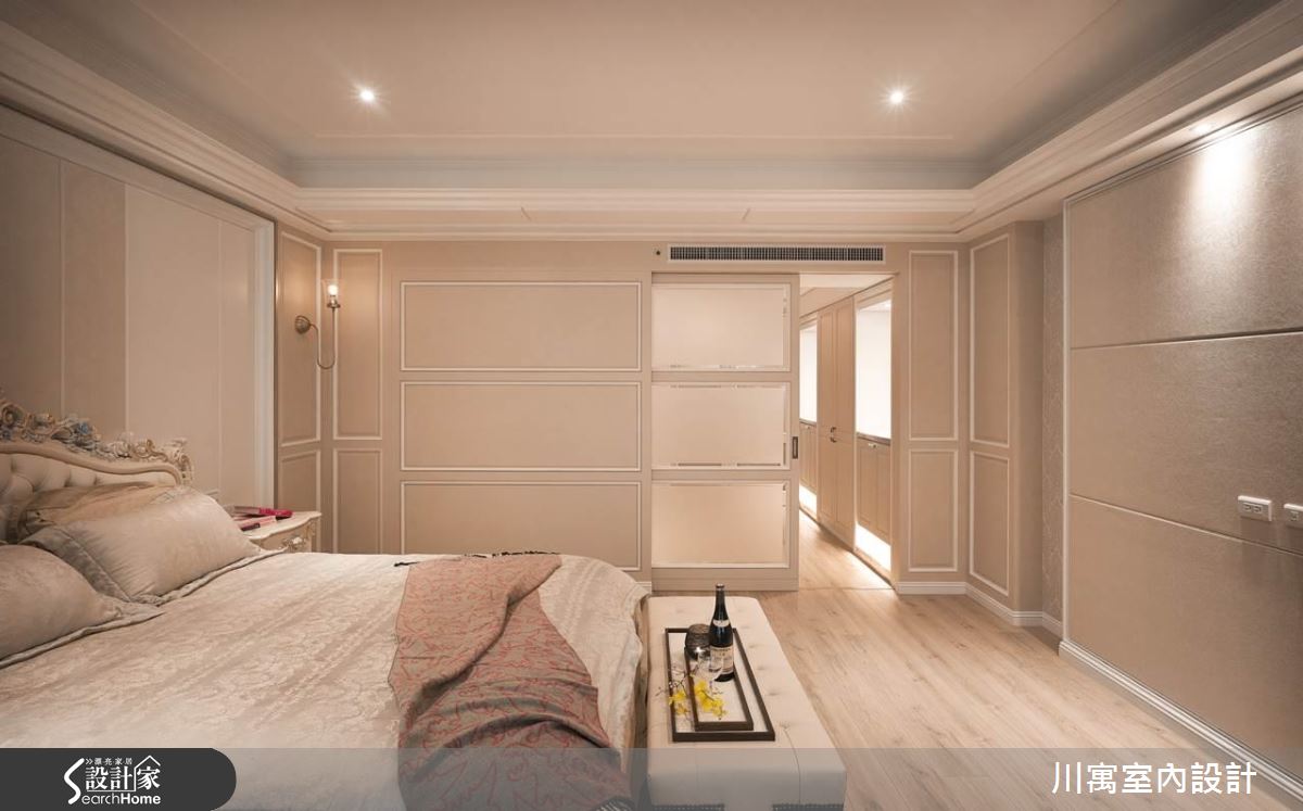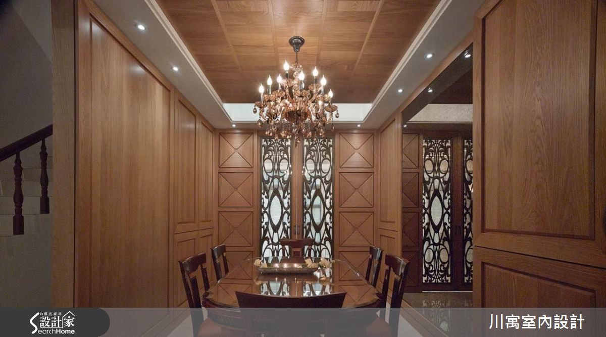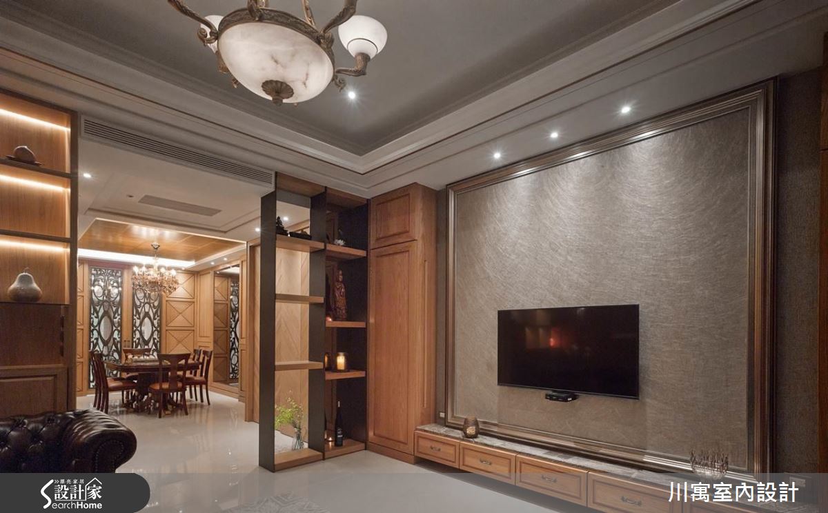 設計團隊以造型線板搭配釘扣皮製沙發與地氈,為公領域注入古典歐式之美,電視牆則採用大地色調,回歸大器簡約。利用兩側櫃體巧妙框設客廳通往餐廳的過道,重整餐廳與獨立廚房格局,利用雕花門片延續歐式風格,並加上落地鏡面成功達到放大空間效果,並讓 L 型設計給予獨立廚房寬裕的烹飪空間。主臥以柔美色調與線條細緻的壁板與家具延續古典風格,比照歐式格局注入起居功能,更利用通往衛浴的動線打造大型更衣間與梳妝台。本案更著重燈光與建材的互動,襯托出建材的本質、打造充滿質感的視覺端景,滿足祖孫三代的居住想望。