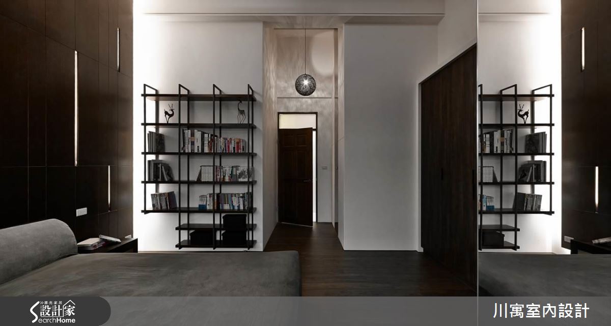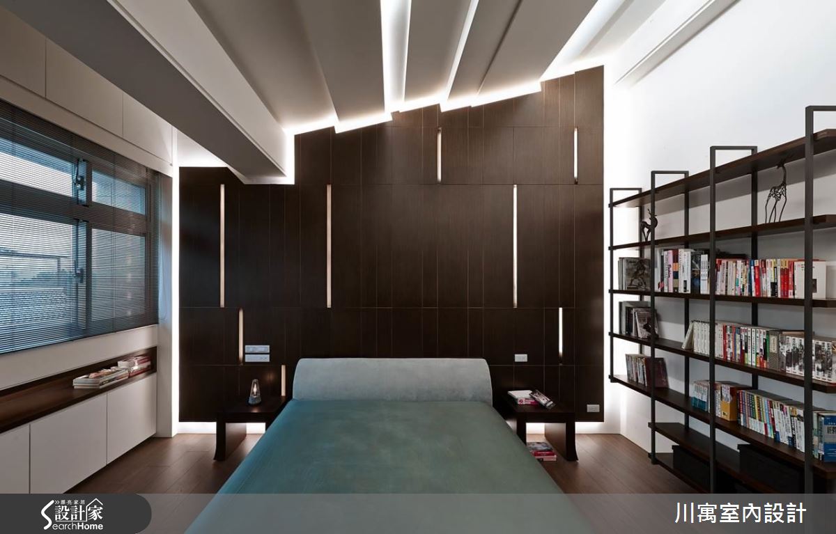 配合不同居住者的性格,利用長條格狀設計巧妙修飾次臥的斜屋頂與樑面,並讓大面積櫃體更兼具獨特的床頭牆端景,佐以鏤空鐵件置物架顯示俐落特色。