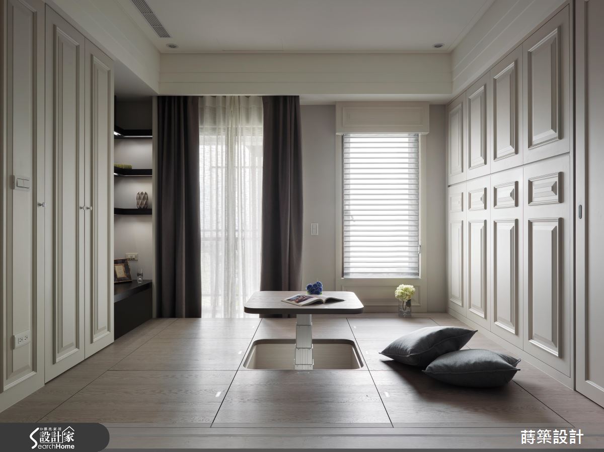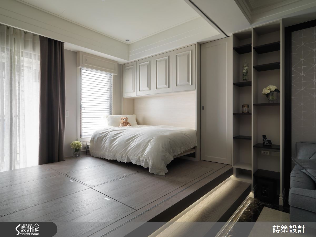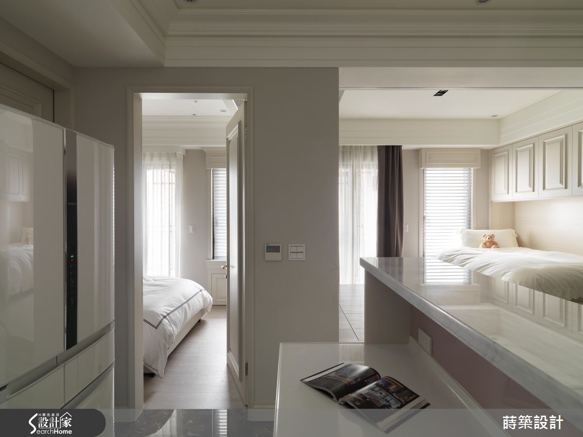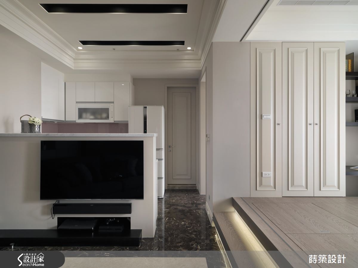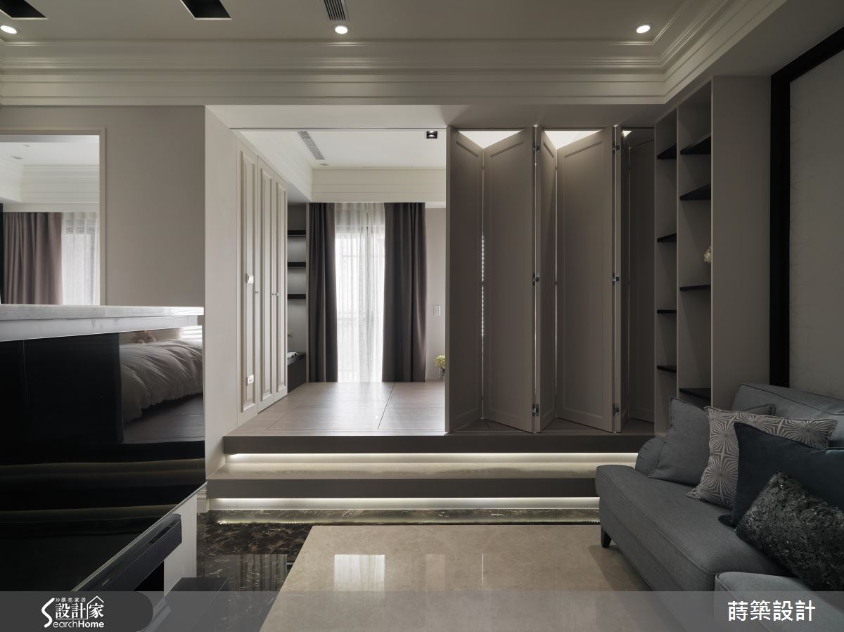 一進門為客廳領域,設計師將電視牆兼做廚房吧檯功能、並結合收納櫃體,整合多種實用機能,且將廚房改為ㄇ字型,導引流暢行進動線,位於客廳旁的則是多元化休憩室,特別精算門片比例、作出可收納於牆的折疊門型塑場域界定,而客廳、休憩區之間則給予階梯高低差,身兼坐臥長椅使用,踏階內部暗藏隱藏光源,營造氛圍之餘亦提供夜燈照明;休憩區內規劃彈性收放的橫式床鋪,不使用時可隱藏於立面,瞬間將寢臥轉換為書房或交誼主題,地面底部不僅配置電動升降茶几,更賦予大容量的收納空間,充分利用每一吋坪效;臥房內絲毫不受限於場域尺度,藉著繃布、壁燈與金屬等元素搭配,佐以明亮採光進駐,勾畫出端莊的大器表情!