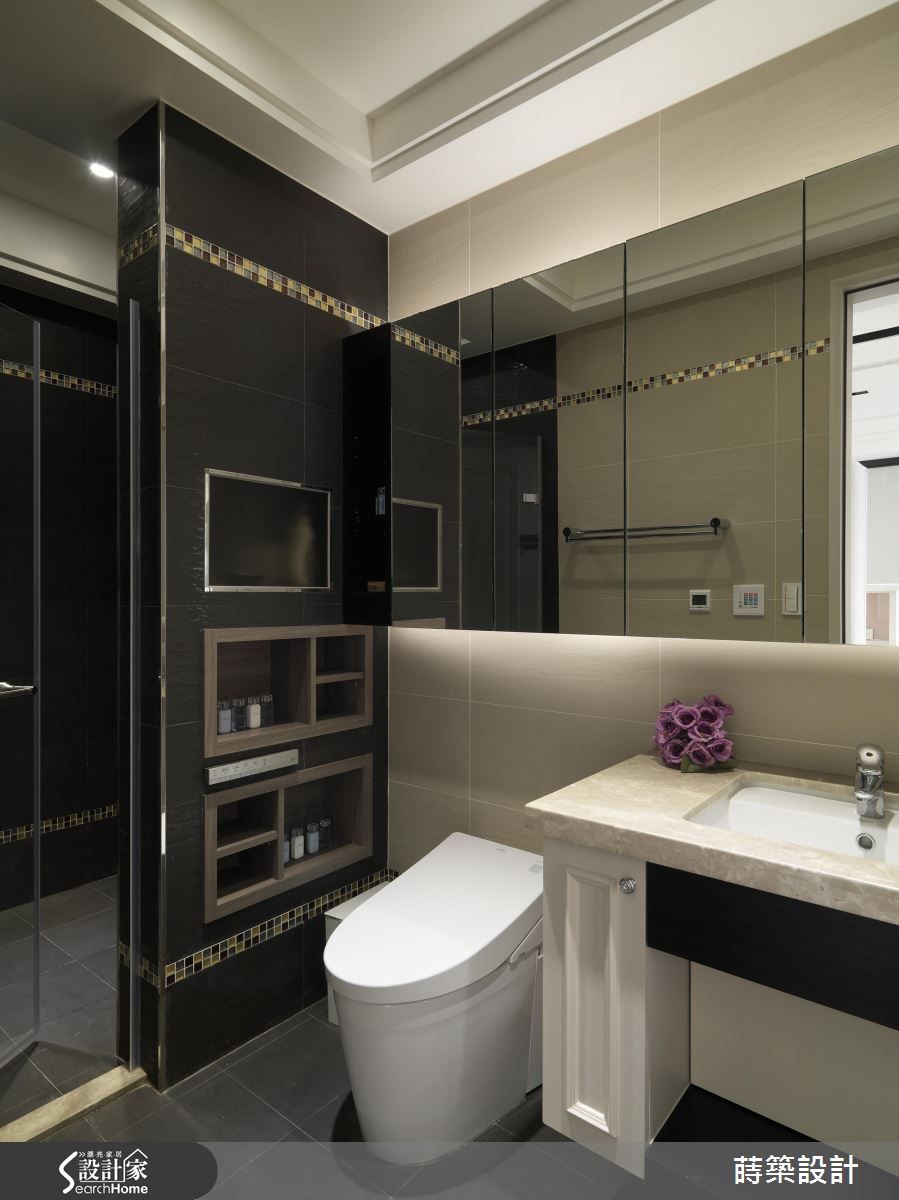 衛浴增加牆面厚度、賦予雙面櫃功能,同時規劃整排鏡櫃提供置物空間,並達到放大場域效果,創造高效率的機能運用!