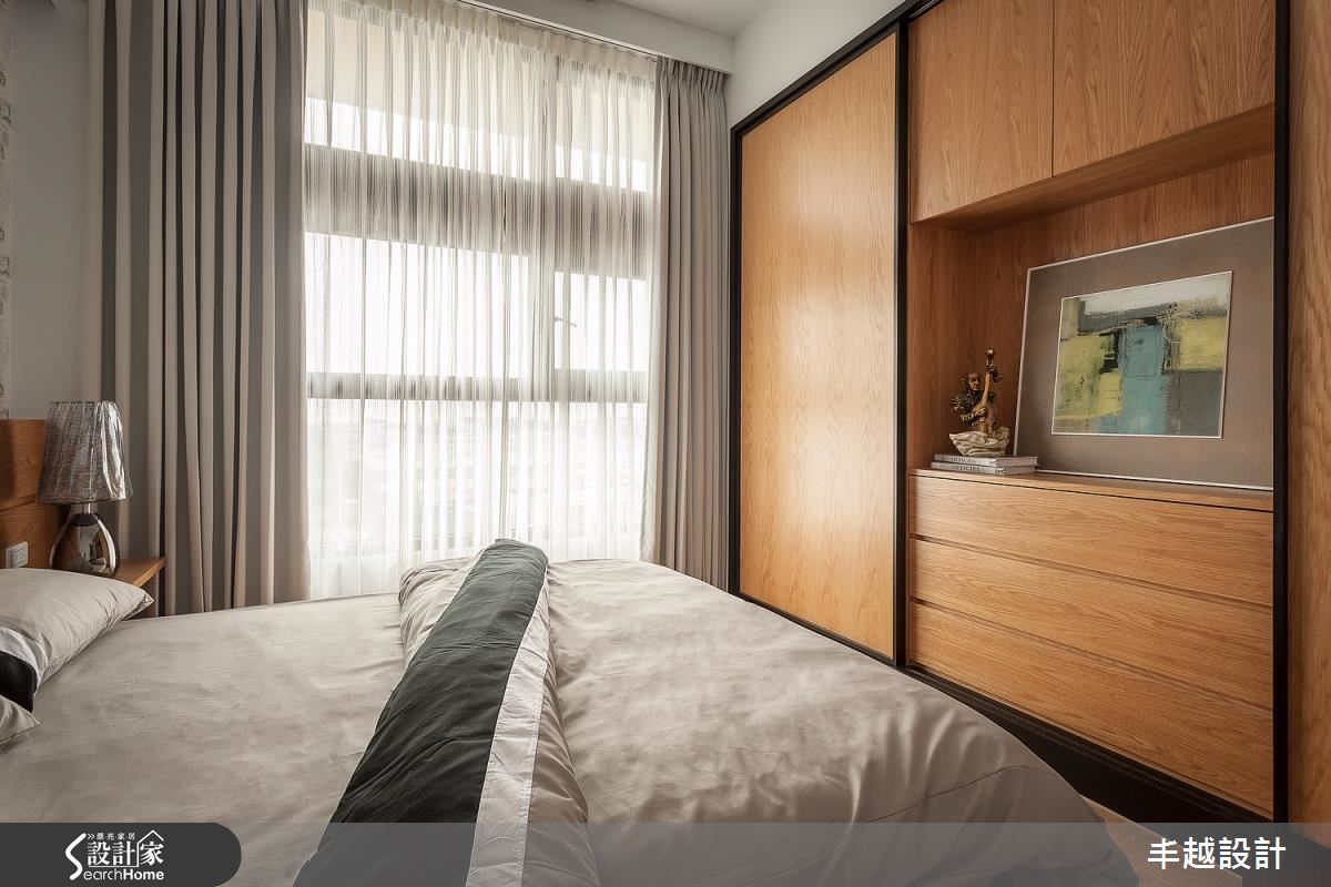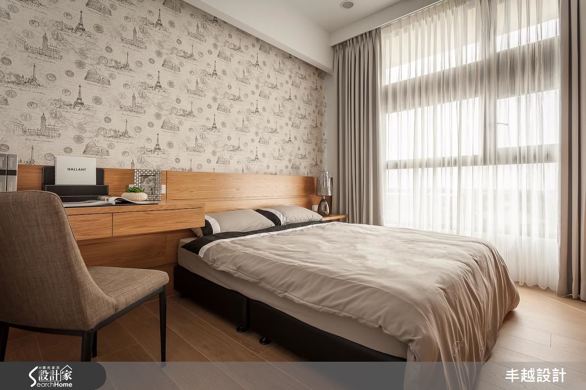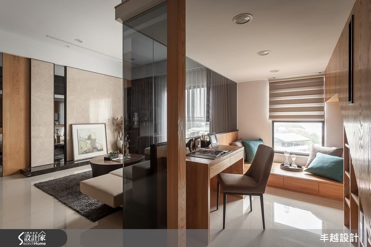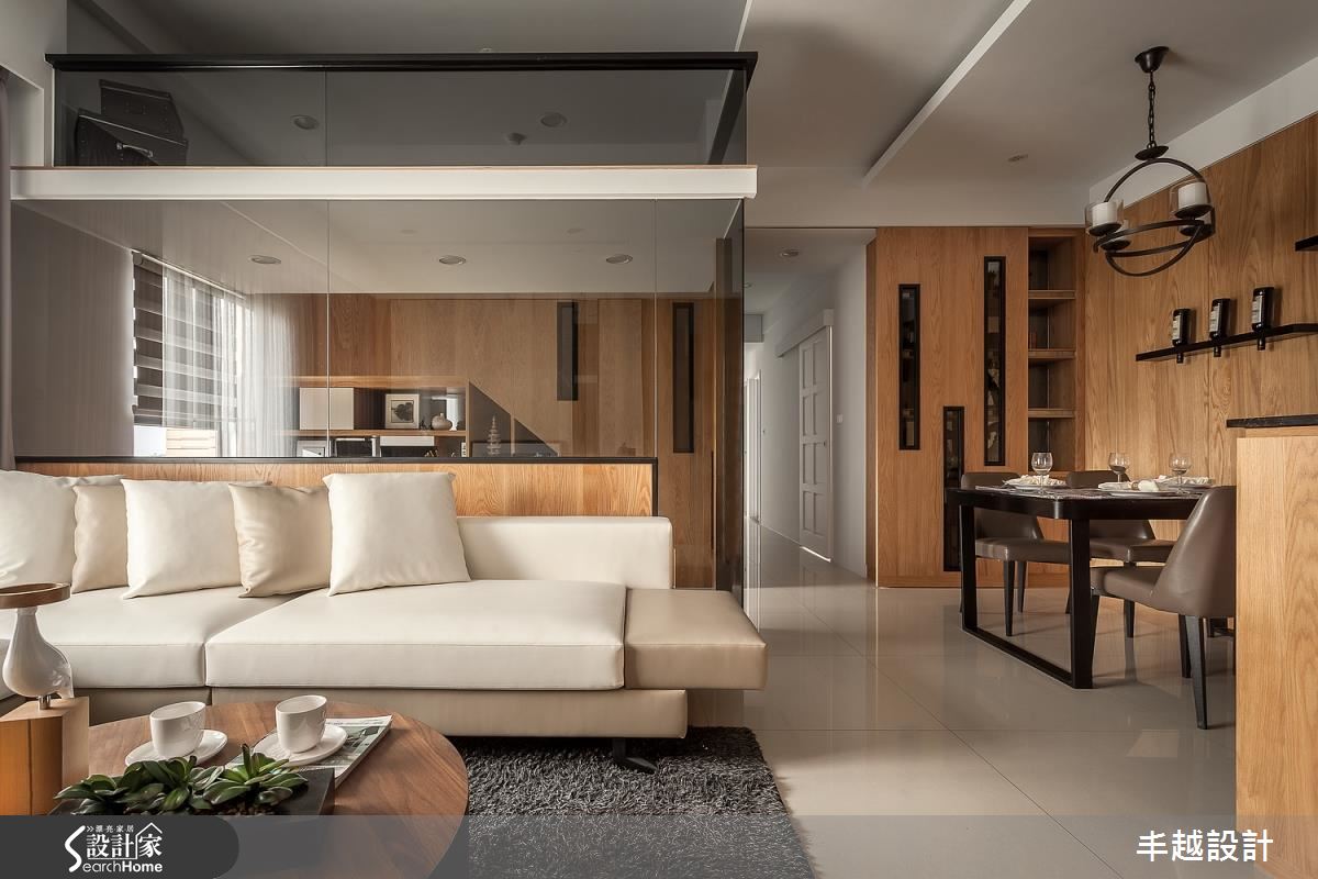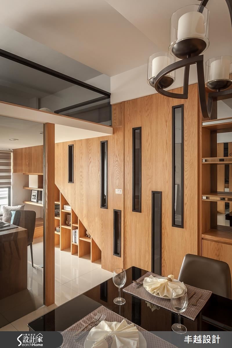 設計師引用大量鋼刷木皮,透過天然質材提升居家暖度,並錯落穿插鏡面與大理石,揉入黑色立體框線,在溫樸底蘊中添入細膩質感,同時採玻璃打造客廳、書房之間的隔間,使場域視覺可通透無礙,且讓書房底端牆櫃型構俐落的端景畫面,書房上方則因應屋高優勢,規劃出一小塊夾層場域,以玻璃加以圍塑,讓視野達到延伸,與樓下廳區保持良好互動:餐區延續木質肌理,流露溫馨宜人的使用氛圍,並巧妙讓紅酒以吊掛形式收納於牆,不僅便利拿取,亦作到趣味展示效果;寢臥於床頭背牆鋪述圖繪壁紙、刻劃清新質感,並讓床頭板、書桌相串聯,床尾牆面則結合櫃體與展示功能,將機能作出完好整合,再融入框線細緻飾邊,呈現典雅多層次的寢居風情!