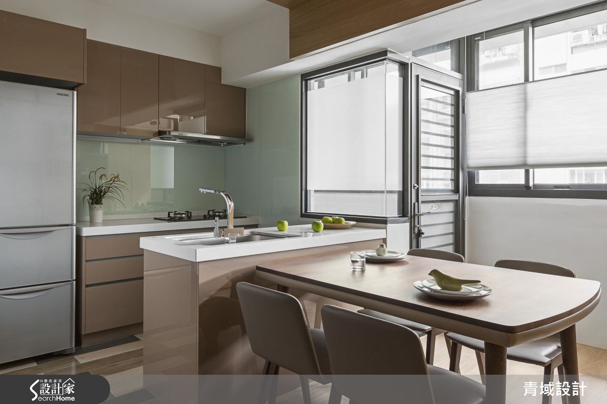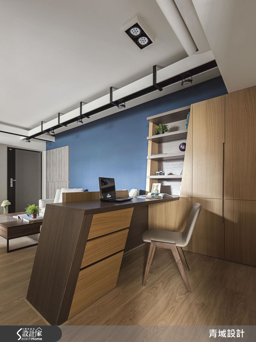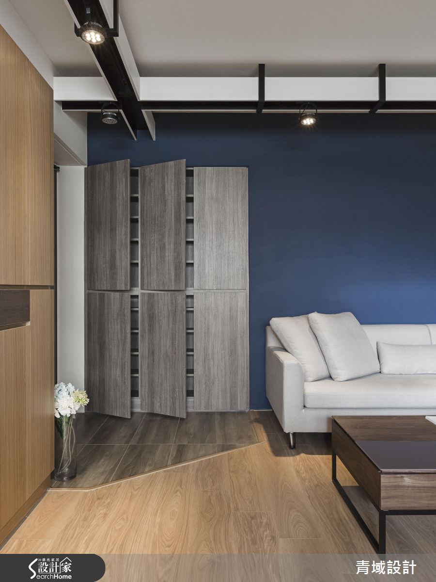 針對一個人的生活,設計師認為毋須過多隔間,因此將原先 3 房改為 2 房,並設計開放式公領域,不僅打開視野,更打造流暢動線。玄關處設置懸櫃同時達成收納與修飾柱體的功能,利用量體結合軌道燈,成功達成視覺拉伸的效果。以清爽的正藍色串聯位於同一水平客廳與開放書房,讓從事 3C 產業的屋主辦公、休閒兩相宜。破除原先的封閉廚房、利用不做滿的電視牆櫃體取代隔間牆,將光線導引至客廳與書房空間,並利用木皮包覆樑面,營造溫潤氣息。設計師將最美好的採光留給餐廚空間,因為居住人口簡單,因此以一字型廚房搭配吧台連接餐桌,打造流暢烹飪動線。針對廚房收納,設計師在底部大型收納牆上嵌入紅酒格,顯示屋主對於生活的品味。