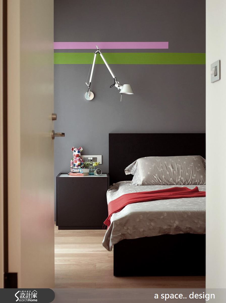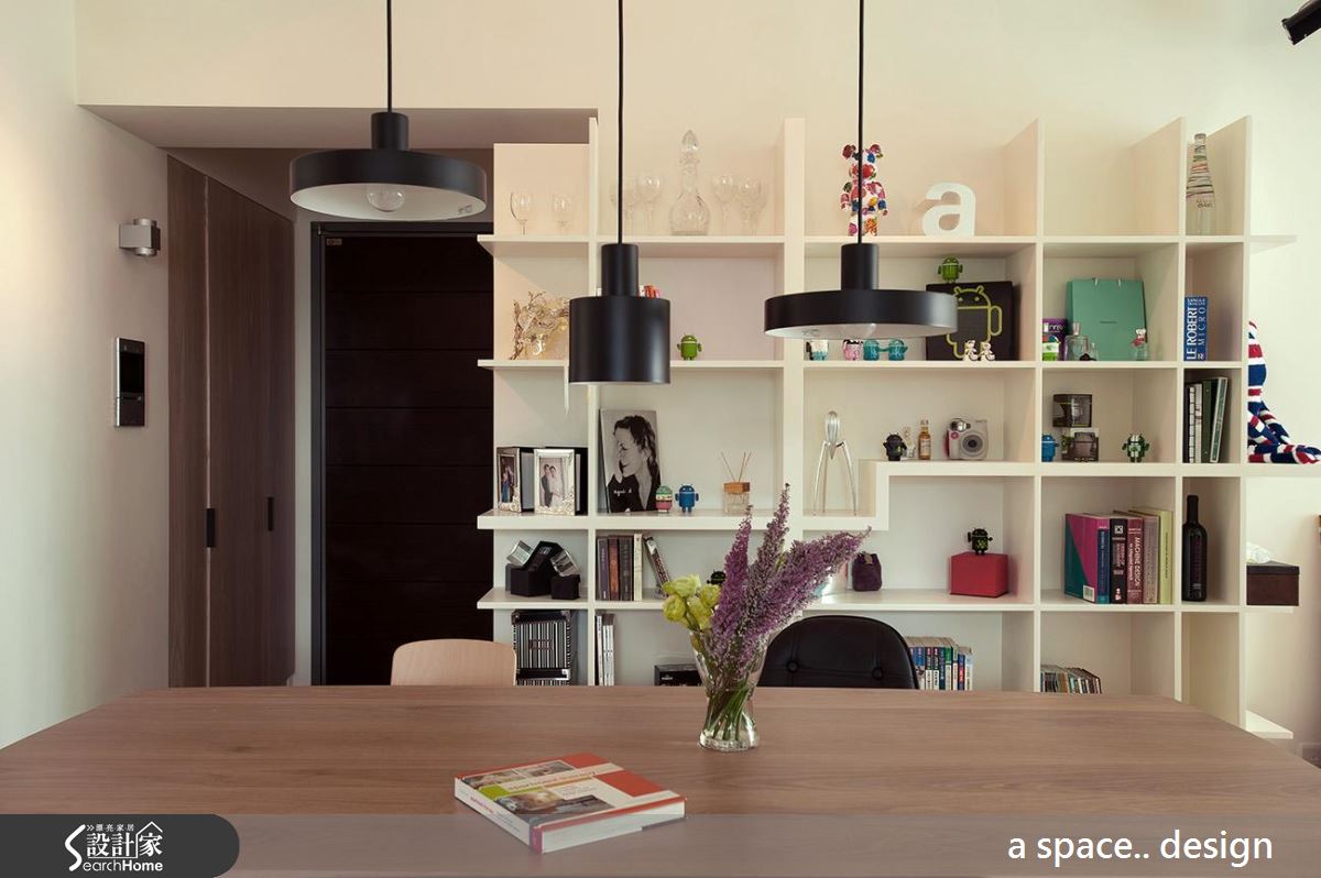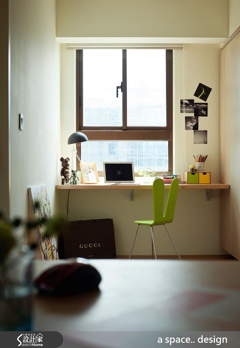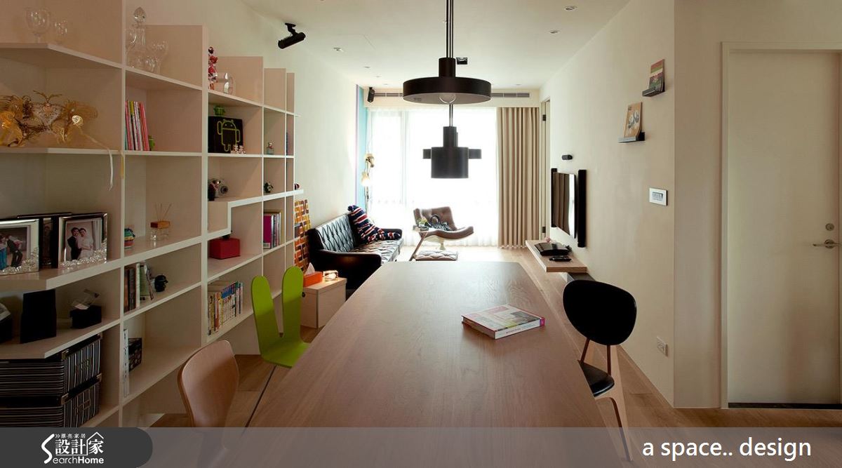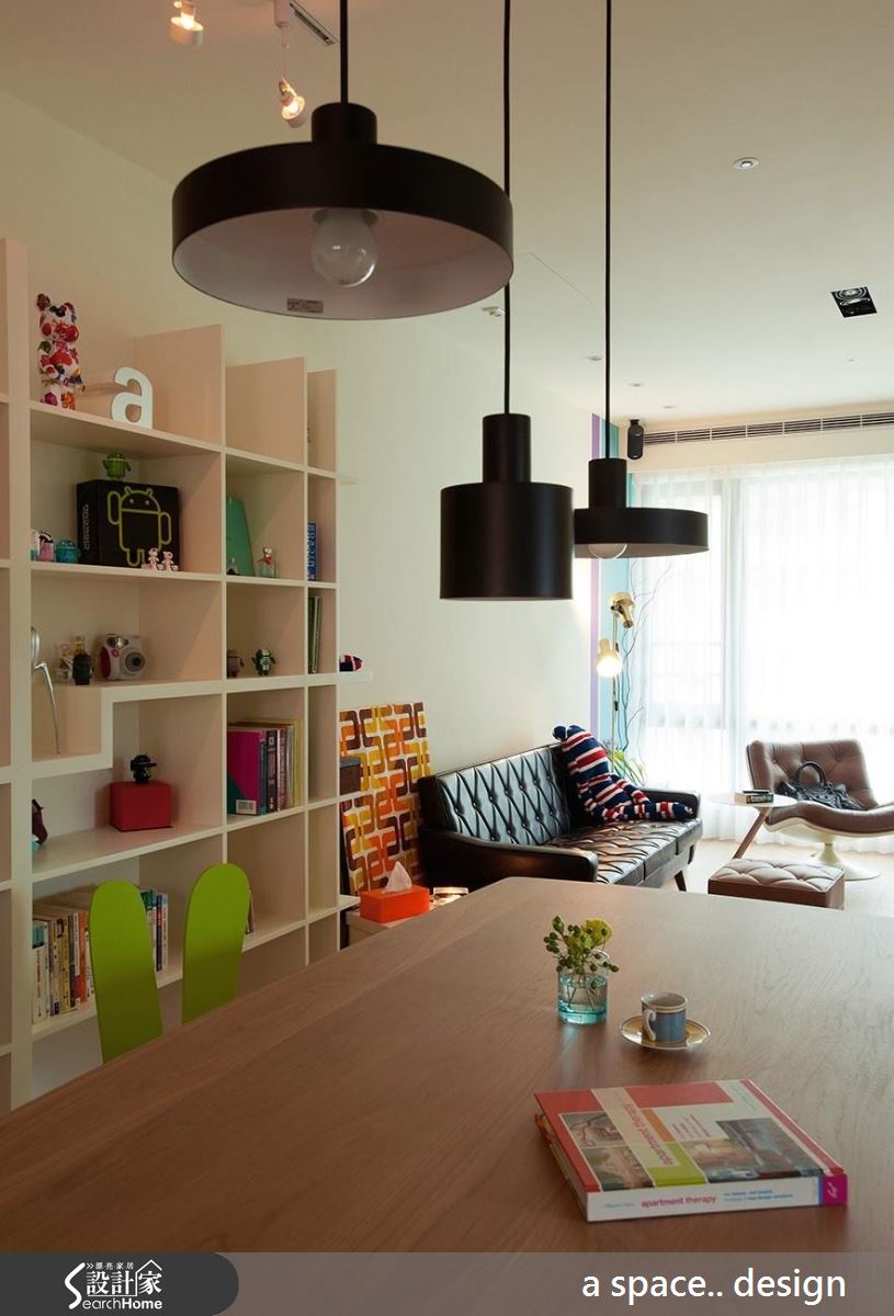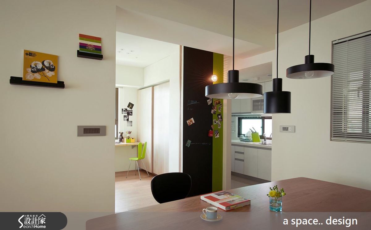 進入這個滿溢著清新活潑氣息,卻不失溫馨感的 2 人生活空間,充滿陽光的採光處安排為客廳用途,收納展示則從玄關一路延伸至可用餐、閱讀的大長桌,後方架上擺入屋主收藏的書籍和小物件,讓銜接客廳和餐廳的過道,搖身一變為紀錄生活點滴的小藝廊。拉開木質門片,後方隱藏一處獨立書房,局部作為衣櫃儲物使用,增添收納效益,連結廚房的外部牆面特意塗上黑板漆,成為屋主可以即興塗鴉的休閒創作區。而來到兩人的臥室,床頭牆繪上溫和沉靜的灰色調,並以粉紅、橄欖綠色條,創造出輕快的跳色趣味。