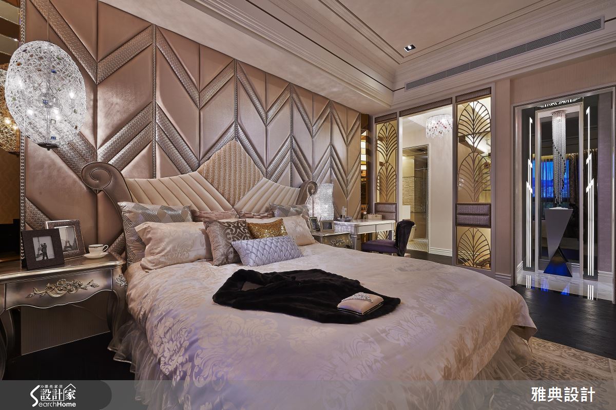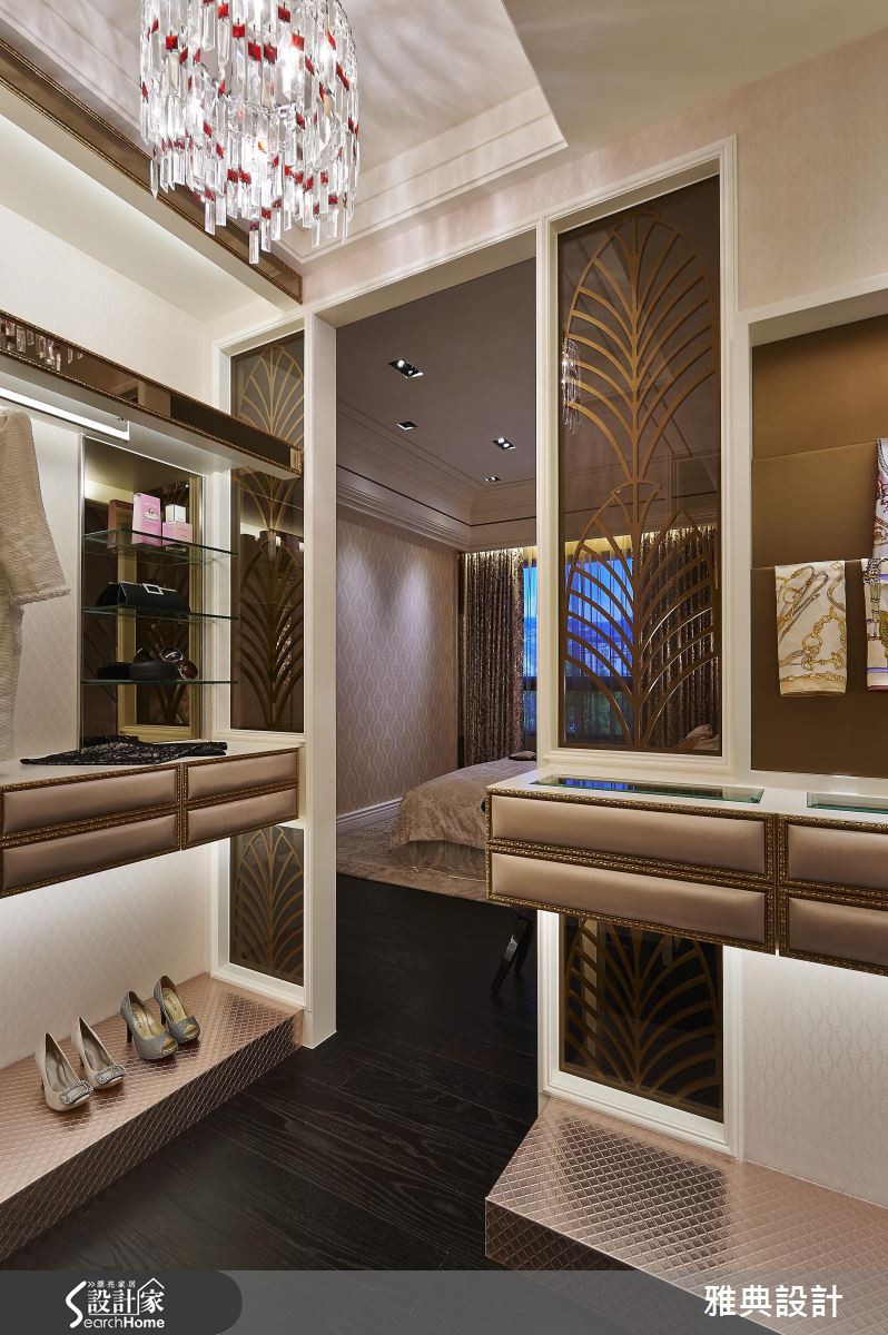 主臥更衣間除了網羅充裕的收納機能,更承襲了鏡面、皮革元素,配上閃亮的水晶燈飾聚焦,將場域妝點成華麗的時尚秀場!