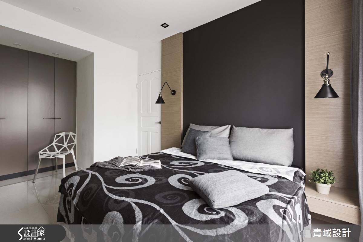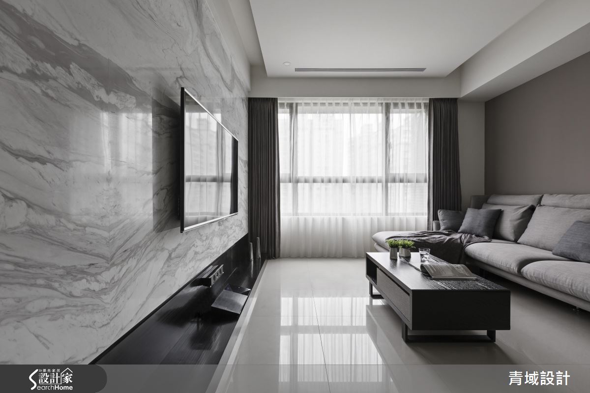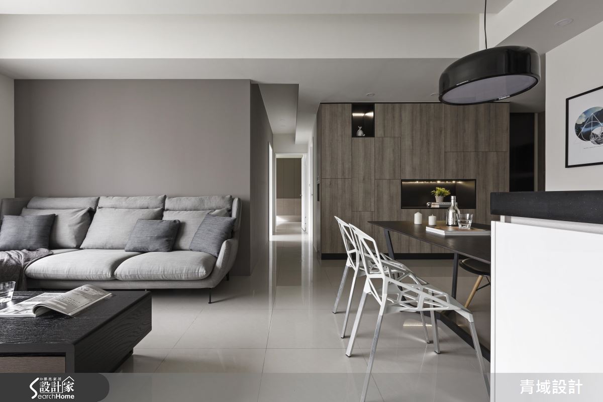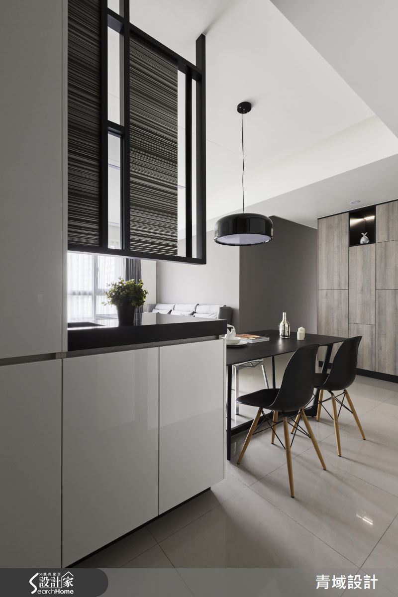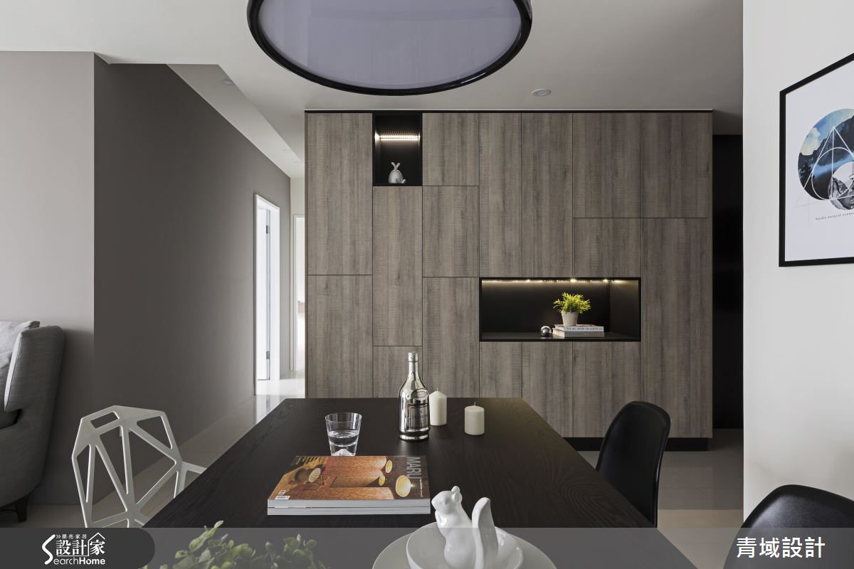 為了修飾風水問題,設計師於玄關規劃鐵件結合千層鏡的通透隔屏,底下配置收納櫃體,跳脫一般屏風的制式形貌;客廳電視牆採以大理石揉入形同潑墨山水的紋理,結合深色木紋,在簡約表情中隱約展現細膩肌理,同時於空間導入大量俐落線條,搭配量體的方正輪廓,演繹立體而安定的生活形貌,並挑選慵懶舒適的灰藍布沙發,適時融入軟性線條,共構高雅溫馨的場景;餐區將收納櫃化為端景主牆,給予幾何塊狀分割、建構組合的視覺樂趣,加以黑邊勾勒邊線,勾畫成一道穩重如山的風景;臥房顯得沉著有味,床頭牆呈現向上延伸的大面積色塊,伴隨兩側床頭燈飾聚焦視覺,而適量的原木色、白色則平衡了深淺比例,完美詮釋了深色的品味潮流!
