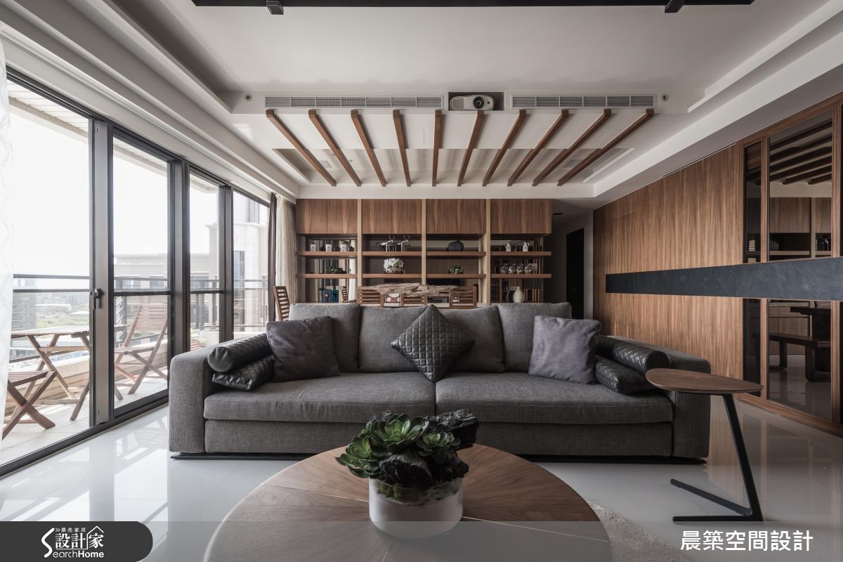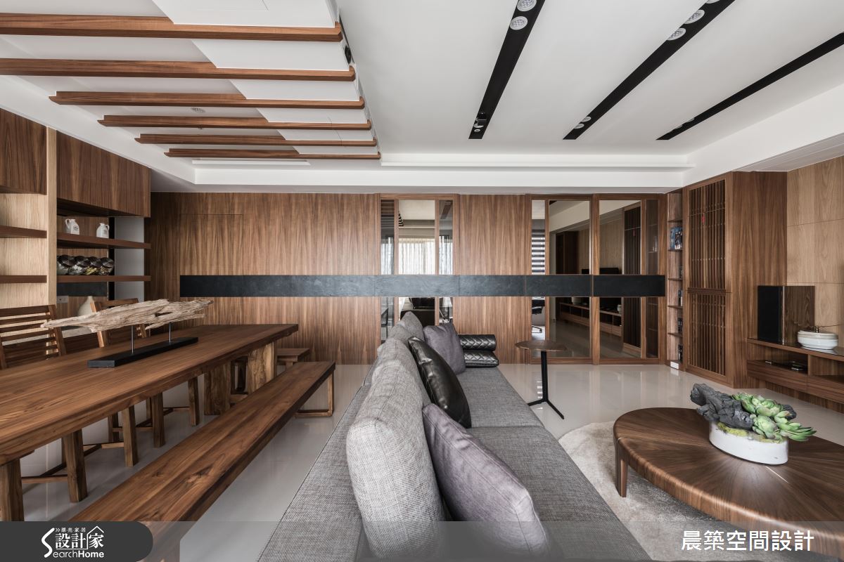屋主為自己與家人購置新居,預備開啟退休後的悠閒時光,由於屋主喜愛實木家具,因此設計師建議在居家空間大量使用木紋,營造溫潤、自然的氛圍。另外,針對屋主相當擔心材質與色調的呈現不合期待,設計師更利用模擬圖溝通,成功化解疑慮。公領域以走道為界,分為兩大區塊,一邊是需要獨立空間的書房與廚房;一邊是給予家人寬裕歡聚空間的開放式客、餐廳。電視牆以隔柵櫃體與木皮組成,成功與實木家具與餐廳底部的大型收納櫃相呼應。後方書房天花以間距較寬的隔柵修飾樑面,進一步劃分開放空間場域。設計師巧妙在餐廳書櫃以及書房、廚房的木質門片上加上大片鏡面,讓公領域更加透亮寬敞。