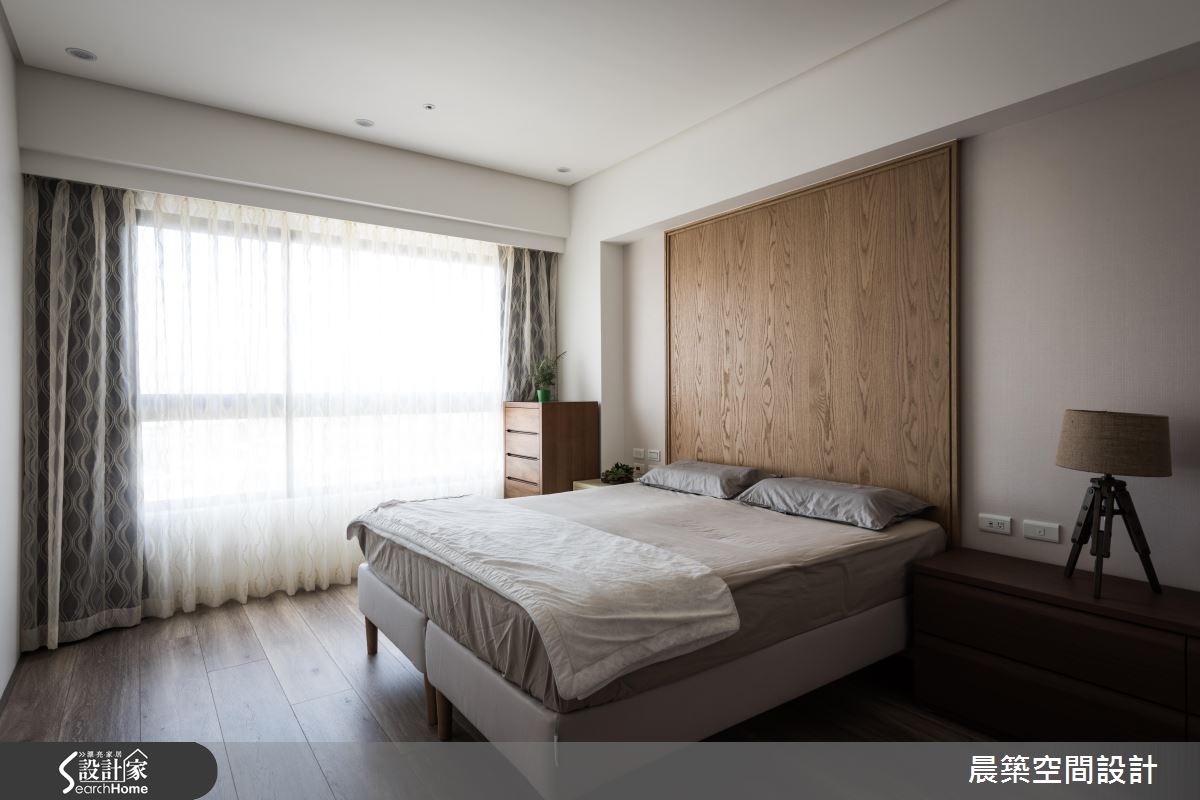 主臥延續整體居家氛圍,除了鋪設木質地板,更在床頭設置大面積木質壁板,營造溫潤自然的舒適氣息。