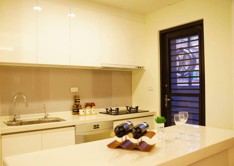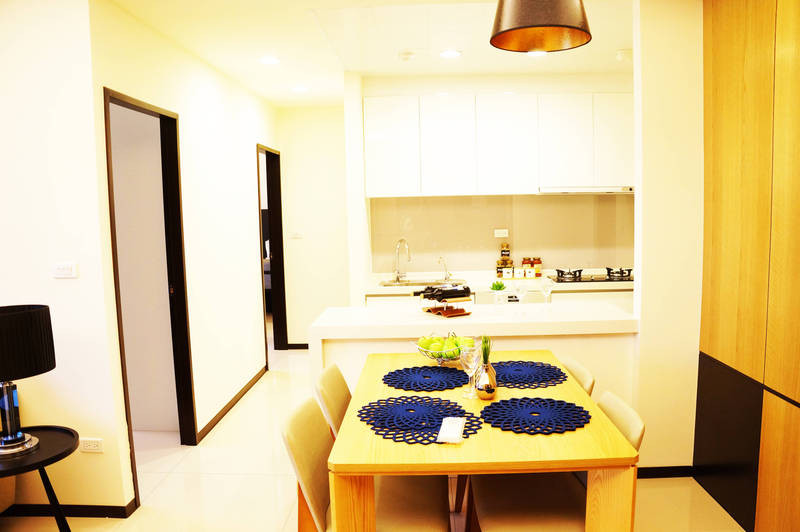 ▲ 廚房空間採用系統櫃的設計,一字排開的呈現方式,讓主婦使用器具更方便。