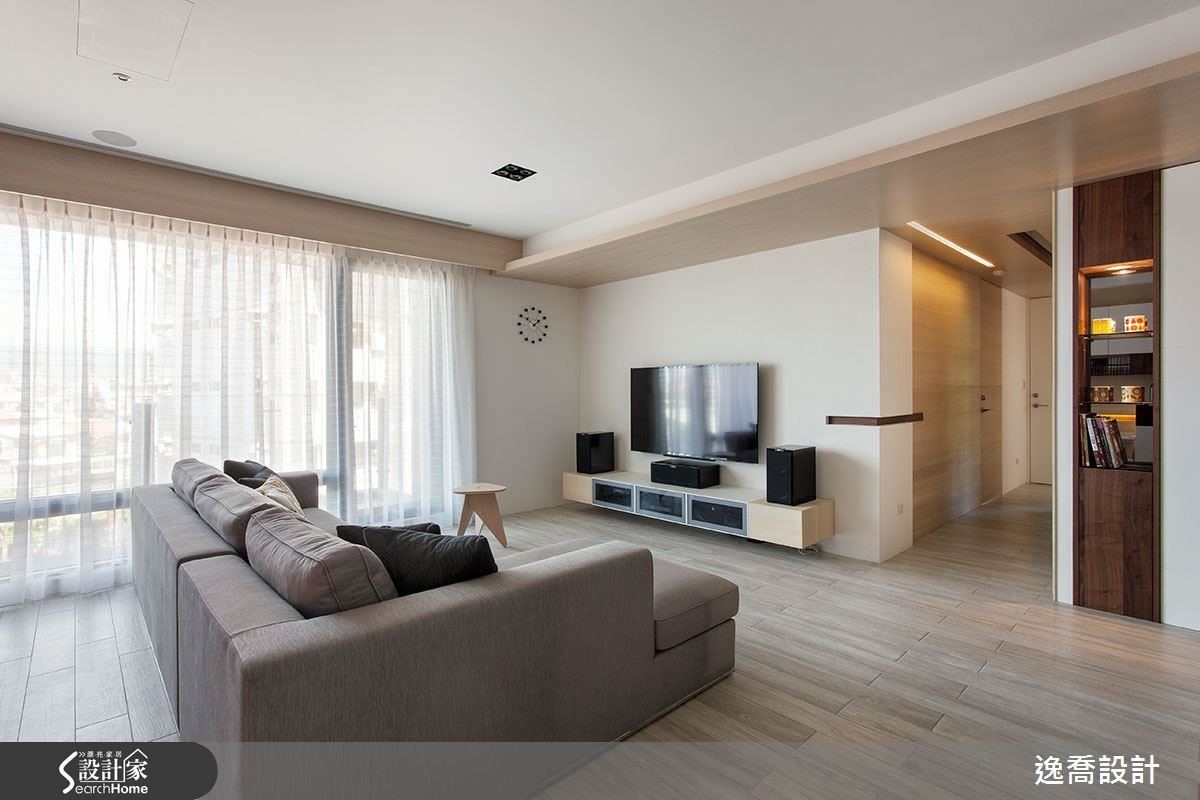 完美空間,一定需要具備「家」的本質,而「家」則是從人出發。逸喬設計從「居住者」的角度思考設計之於空間,再延伸到色彩、線條、材質與水平垂直比例的搭配運用,如同36坪的本案,居住著一對夫妻與一隻毛小孩,設計師將原本4房2廳的格局依照屋主需求,重新規劃為2+1房2廳,整體空間依照屋主喜愛的簡約元素為主軸,以清淺淡雅的乾淨色調,輔以大量的木質元素,俐落的空間線條伴隨著溫潤的木紋理,交織出悠然無壓的生活氛圍。