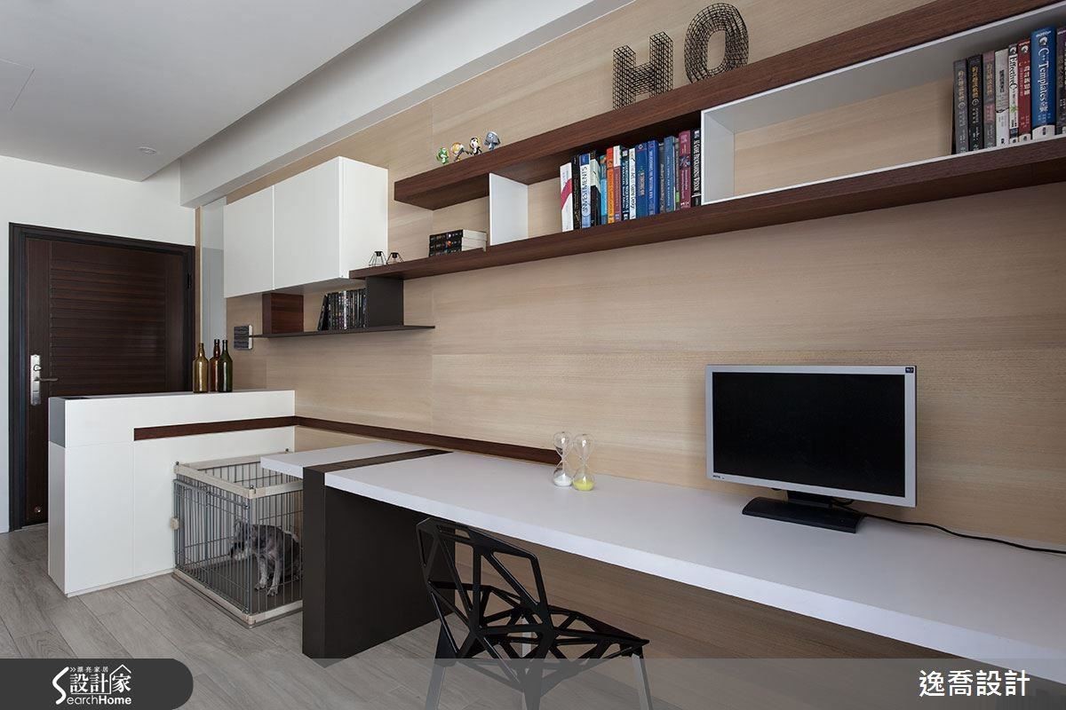誰說書房一定要區隔成獨立的空間?逸喬設計將兩夫妻的生活領域規劃得既緊密,又保有獨立性,但又能擁有流暢的動線。利用客廳沙發陳列,區隔出客廳區與工作區,工作區背對著客廳的設計,因著一整面的木皮貼牆而安定了空間。將工作桌結合吧台設計與毛小孩的家,突顯出兩人一狗的悠閒生活。