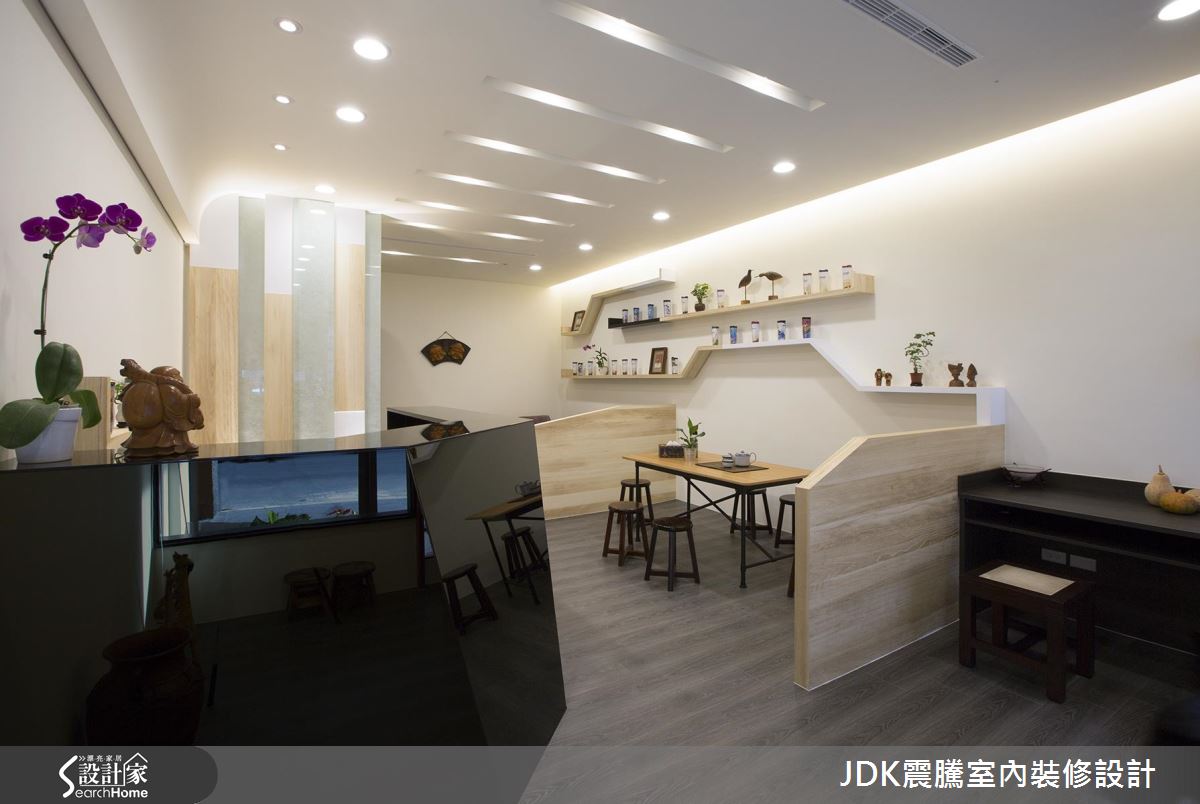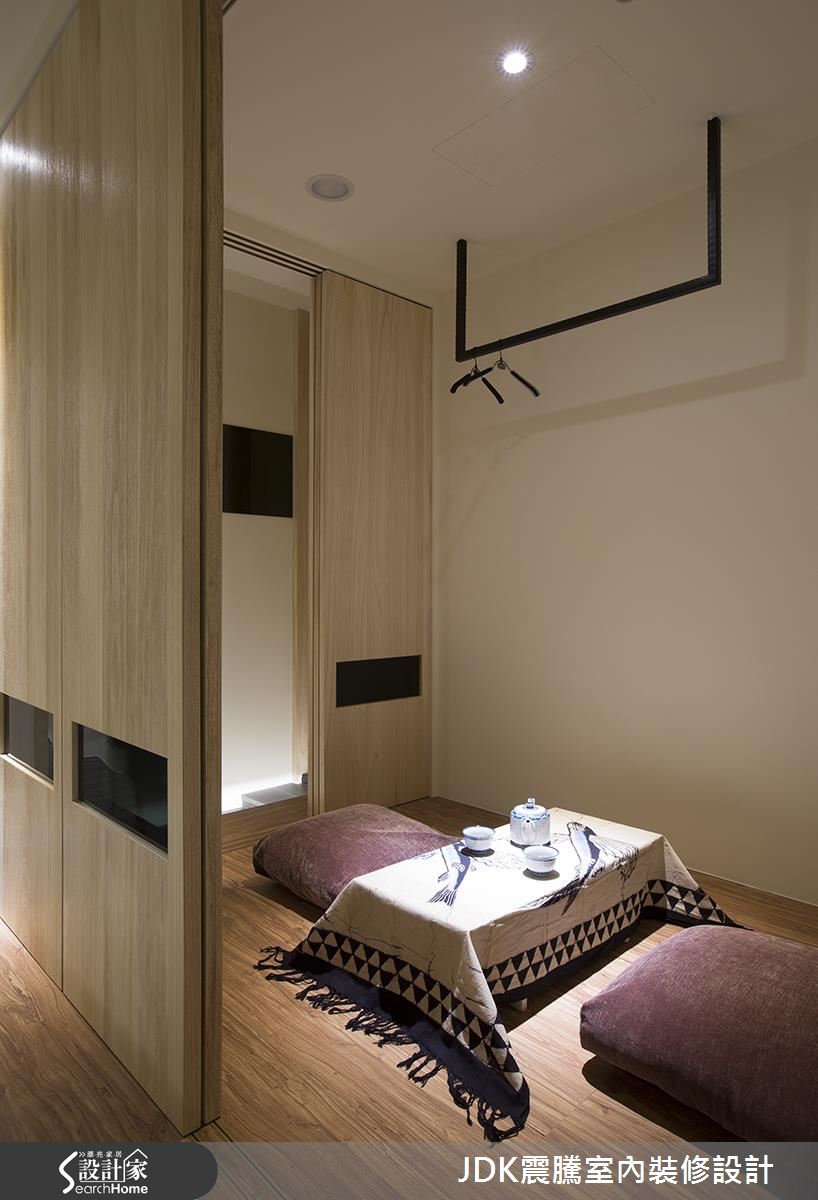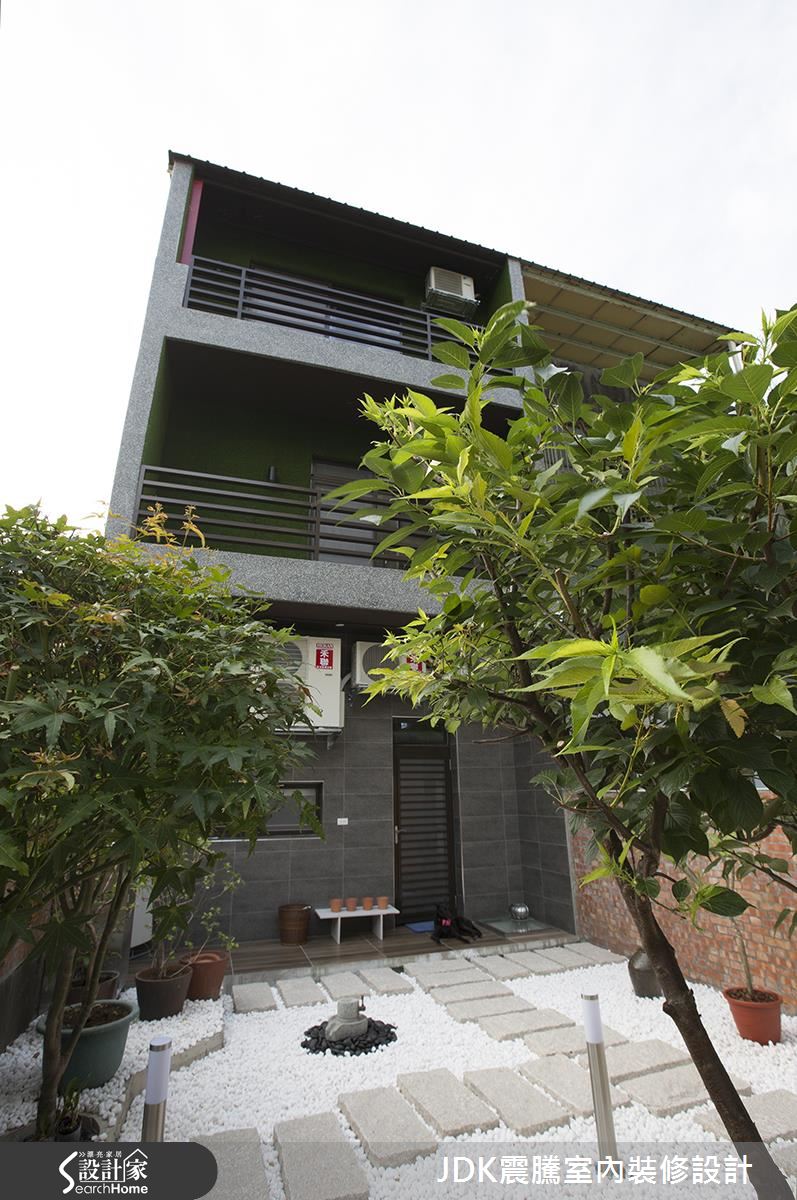 當住商混和,公、私領域的劃分相形重要,同時兼具主人的隱私與背包客的舒適度,是本案的最大的規畫重點。由於腹地足夠,前後皆設置庭園,援引大量綠意進入室內。由於室內空間狹長且只有單面採光,因此一樓公共空間以純白色調為主,佐以色調輕淺的木元素,並使用夾紗玻璃與矮牆巧妙劃分迎賓與後方屋主客廳空間。將私人和室與餐廚空間隱身廊道門片後方與尾端,不與公共區域相混和。針對背包客房的設計,設計師兼具了溫度與巧思,除了打造個人專屬照明,更設置獨特的鐵件衣桿。
