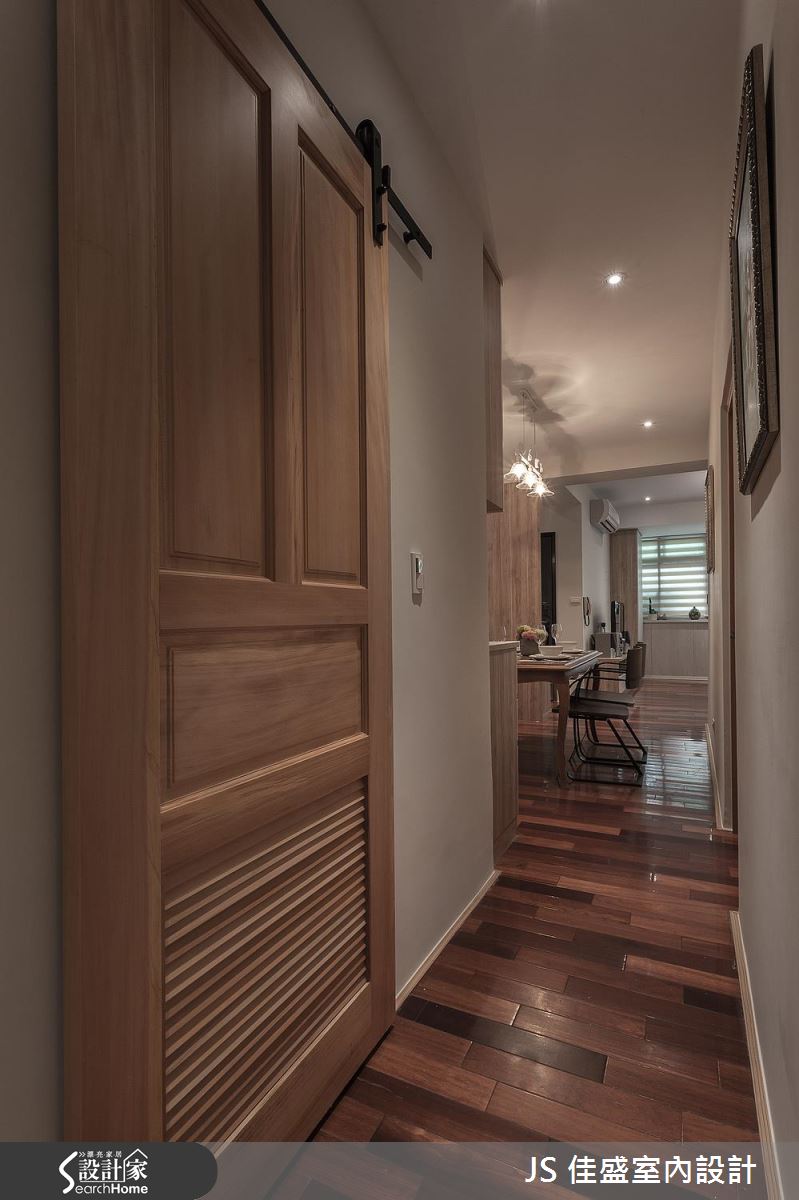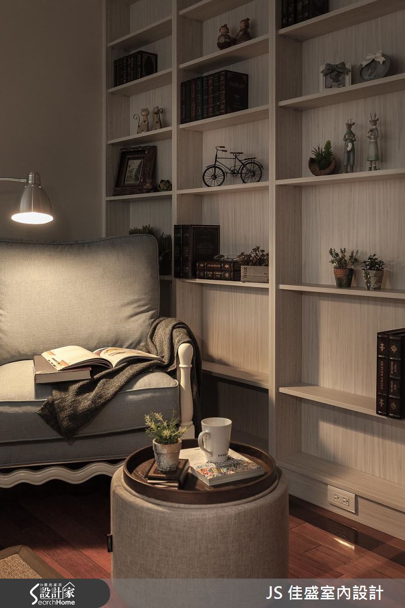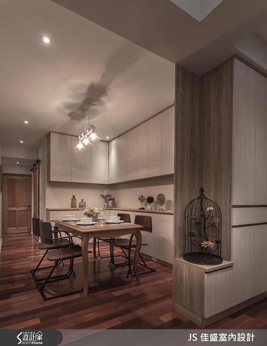 整體空間以溫和大地色系為主,渲染上柔美精緻的燈光,再搭配淡雅的沙發色調,散發著暖暖的居家溫馨感,地坪則採用海島型木地板鋪飾,運用不同的深淺色拼接,挹注色彩層次的豐富變化。在收納配置上,客廳側邊規劃一整面開放展示櫃,收藏屋主的書籍和紀念品,成為極具人文生活感的端景牆,餐廳處沿著牆面打造 L 型櫃體,讓碗盤餐具的取用更加方便。從廊道向內深入,設計師為房間換上木質門片,延續風格的一致性,並隨著使用者的需求賦予收納、閱讀等機能性,同時也營造出典雅沉穩和溫暖柔美等不同睡眠氛圍。