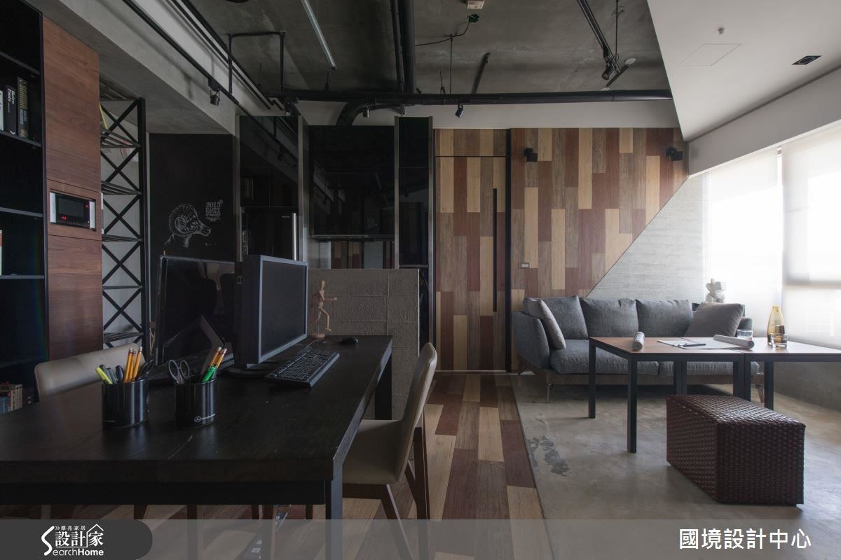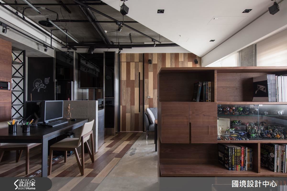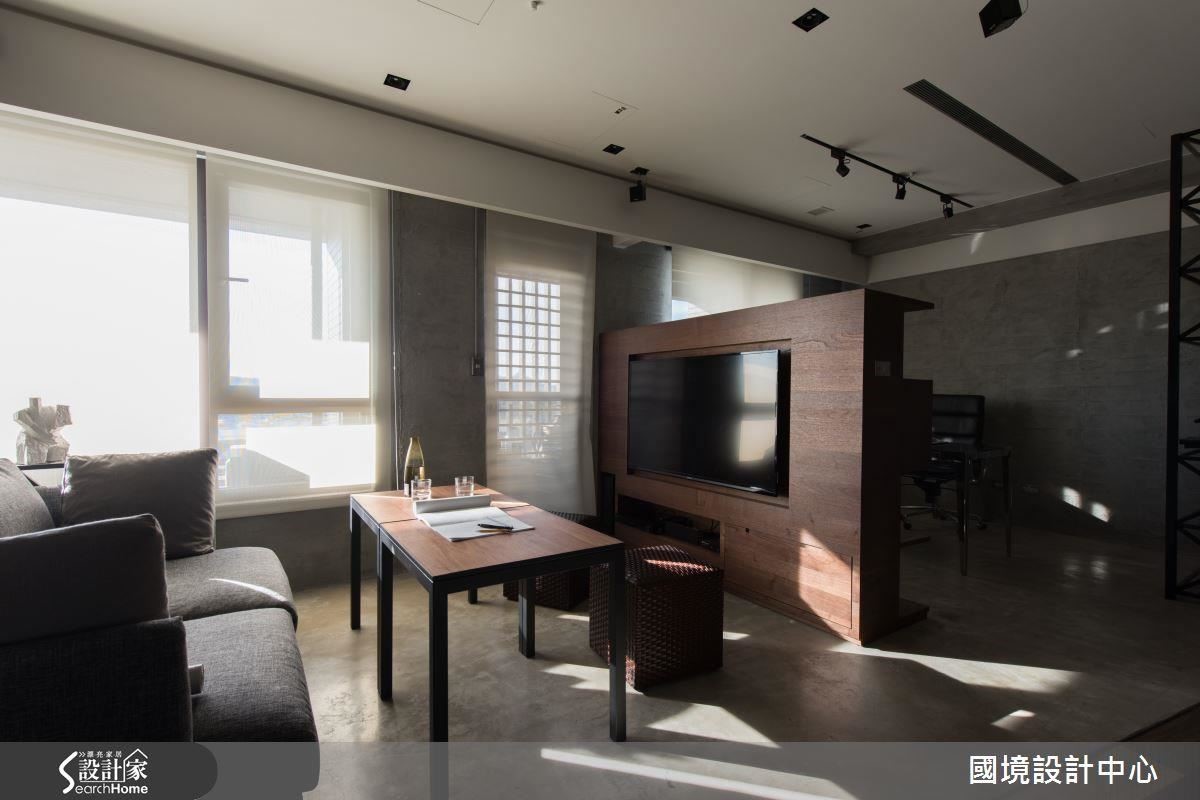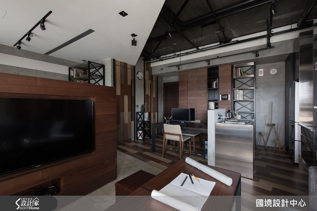 將住辦機能置於同一空間,選擇以開放式設計與地坪材質切分場域性能,將空間一分為二,並安排客廳在採光優良處,以水泥粉光地坪與軌道照明提純個性工業風格。針對收納部分,因應大量書籍收納需求,除了空間底部的書牆外,設計師整合電視牆與櫃體,讓複合設計同時得以減省空間與拓增機能,創造和諧、開闊的休閒氣息。