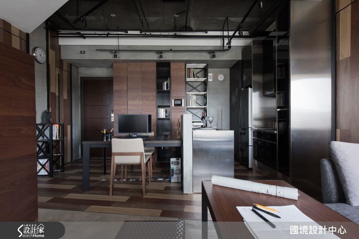 利用不鏽鋼流理檯與水泥矮牆巧妙劃出另一側的工作區域,設計師從沙發背牆的斜角開始,延伸至地坪與對牆,皆採用色調錯落有致的木色拼貼,形成延續感十足的端景,抹除了流理檯與矮牆的冷冽調性,同時在工業風空間中創造溫潤的一道視覺意象、加深場域分野。另外,天花以斜角設計除了呼應壁面設計,更增添了富有層次的視覺感受。