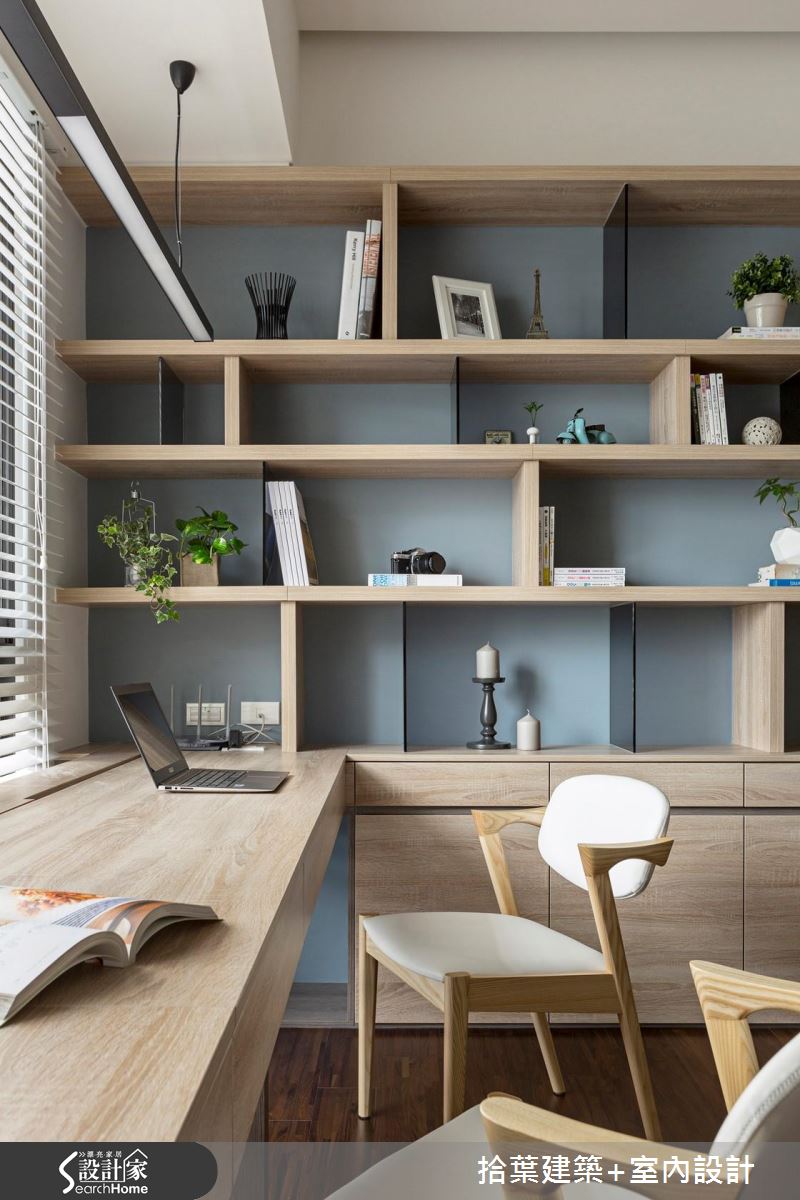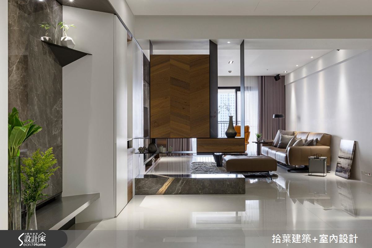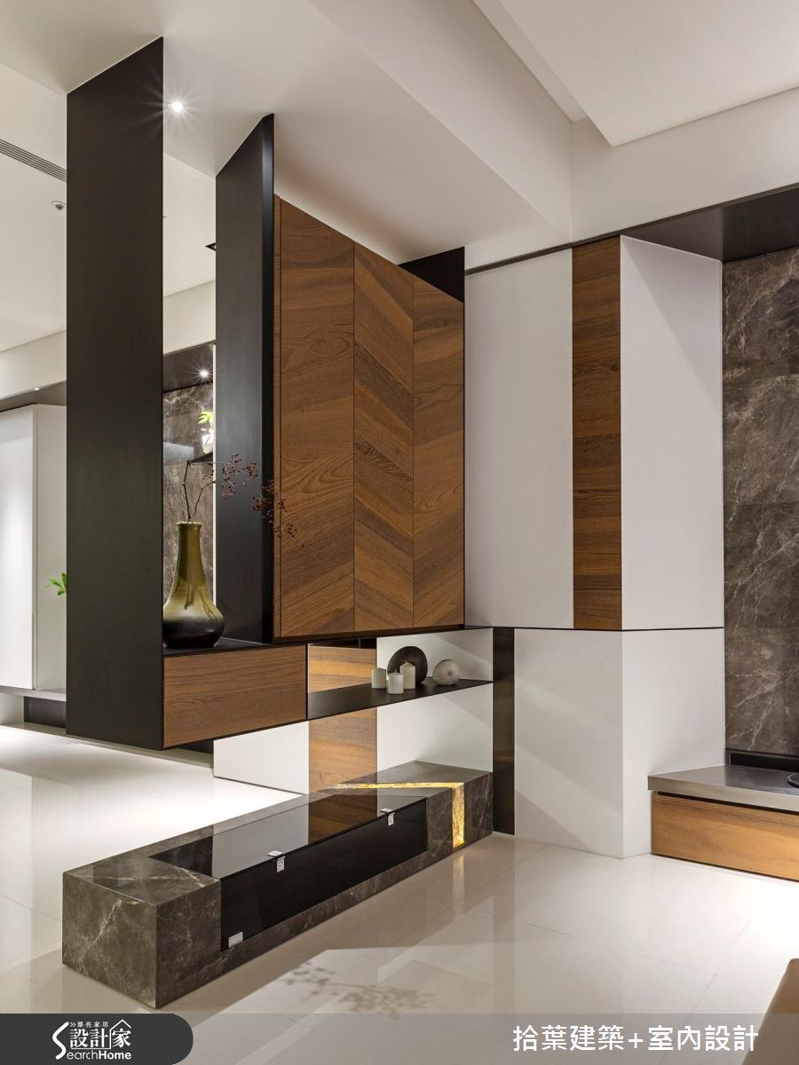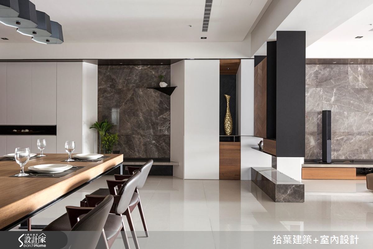 設計師以「深層暈染」的核心概念,透過視覺的推移來引導整個空間動線,特別是幾何形的層架與櫃體鑲嵌在壁面上,更化作客、餐廳之間的懸掛櫃體,結合鐵件與木皮的冷暖元素,橫縱之間勾勒出平衡視感,虛實相間的安排,框構出立體層次之美。整體空間藉由大量的木紋肌理鋪敘,平衡石材、鐵件的冷調質感,加上自然光的引入,營造出靜謐、放鬆的沉澱時光;客餐廳以玻璃拉門作為隔間,隨著光源的照射,調和出開放、柔和的室內感受;收納機能整併於壁面空間,藉由立體線條的描繪,創造出美感與實用兼具的雅居。