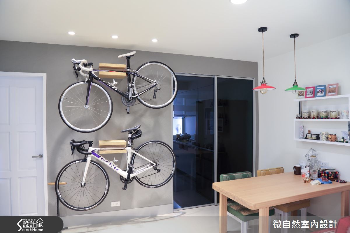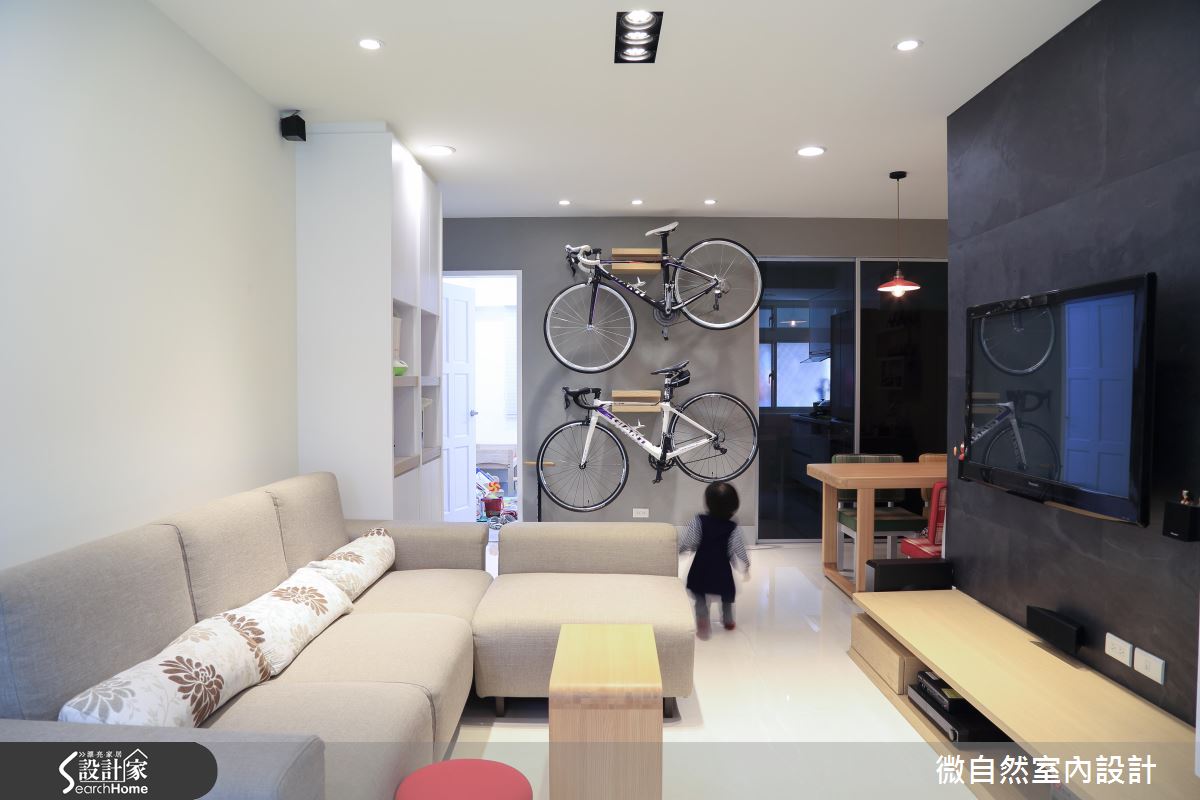 設計師認為本案最大的挑戰是重整觀景窗與陽台,收攏機台及管線,並創造休閒自然的感受。因此設計師設置花台,並利用延伸至室內的南方松包覆外部管線,接著去除被分割零碎的磨砂玻璃窗面,重拾通透感與採光。針對格局分配部分,雖不動基本格局,但設計師因應屋主對於獨立餐廳的想望,規劃獨立廚房,將原先占用餐廳空間的冰箱移入廚房空間,並以鋁框拉門作為分野,有效提升一家 4 口的用餐品質。材質選擇上,電視牆以拓彩岩交錯拼接,佐以閃電造型鞋櫃,並在塗刷珪藻土的牆面增設單車架,凸顯屋主夫妻的對於戶外活動的愛好,更成為特殊的居家端景。