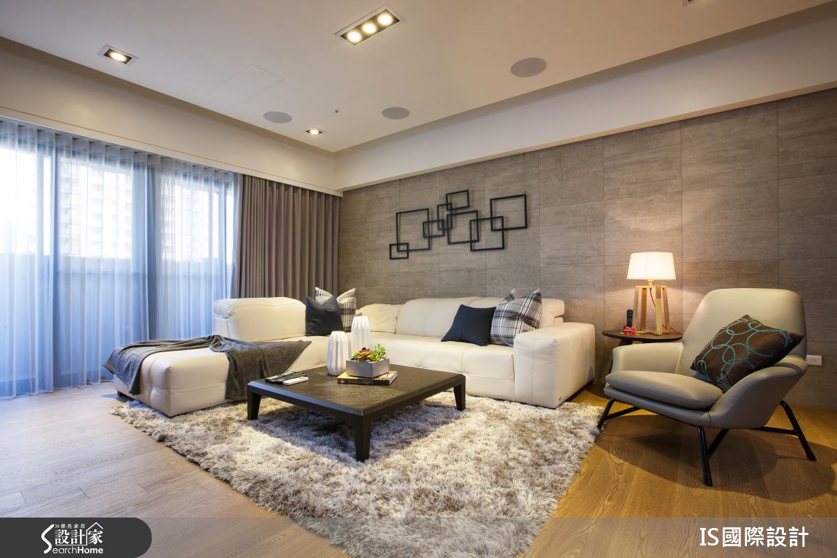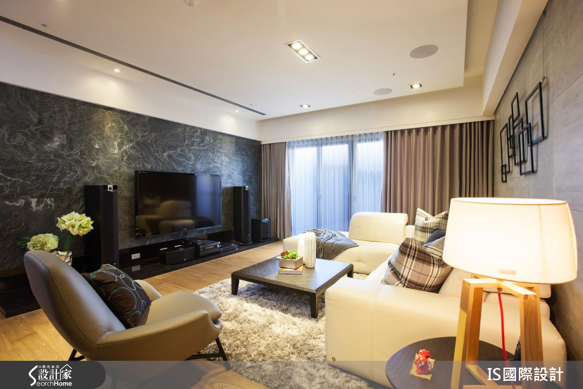 以現代風格替室內設計定調,簡約、低調的樸質用色蔓延開來,深色調的石材壁面擘劃壯闊氣勢,成為客廳的電視主牆,再透過梧桐木的溫潤肌理鋪敘地坪,平衡冷色調質材的感受並賦予空間溫度;局部領域以適度的暈黃光源調和,烘托出建材本有的細膩紋理與色澤,大小不同的方框堆疊出沙發背牆的獨特視覺,藝術畫作與雕塑品佈置在室內各個角落,讓摩登的現代美學挹注些許人文品味。