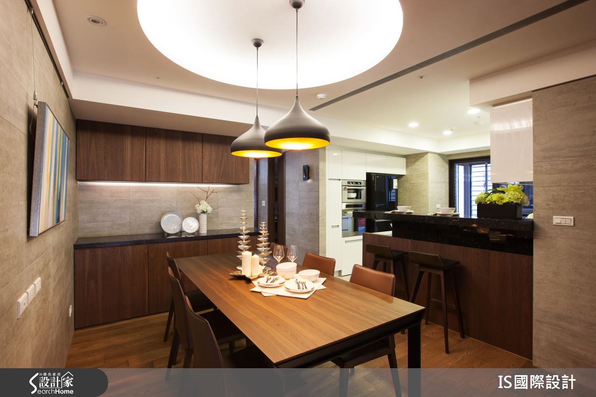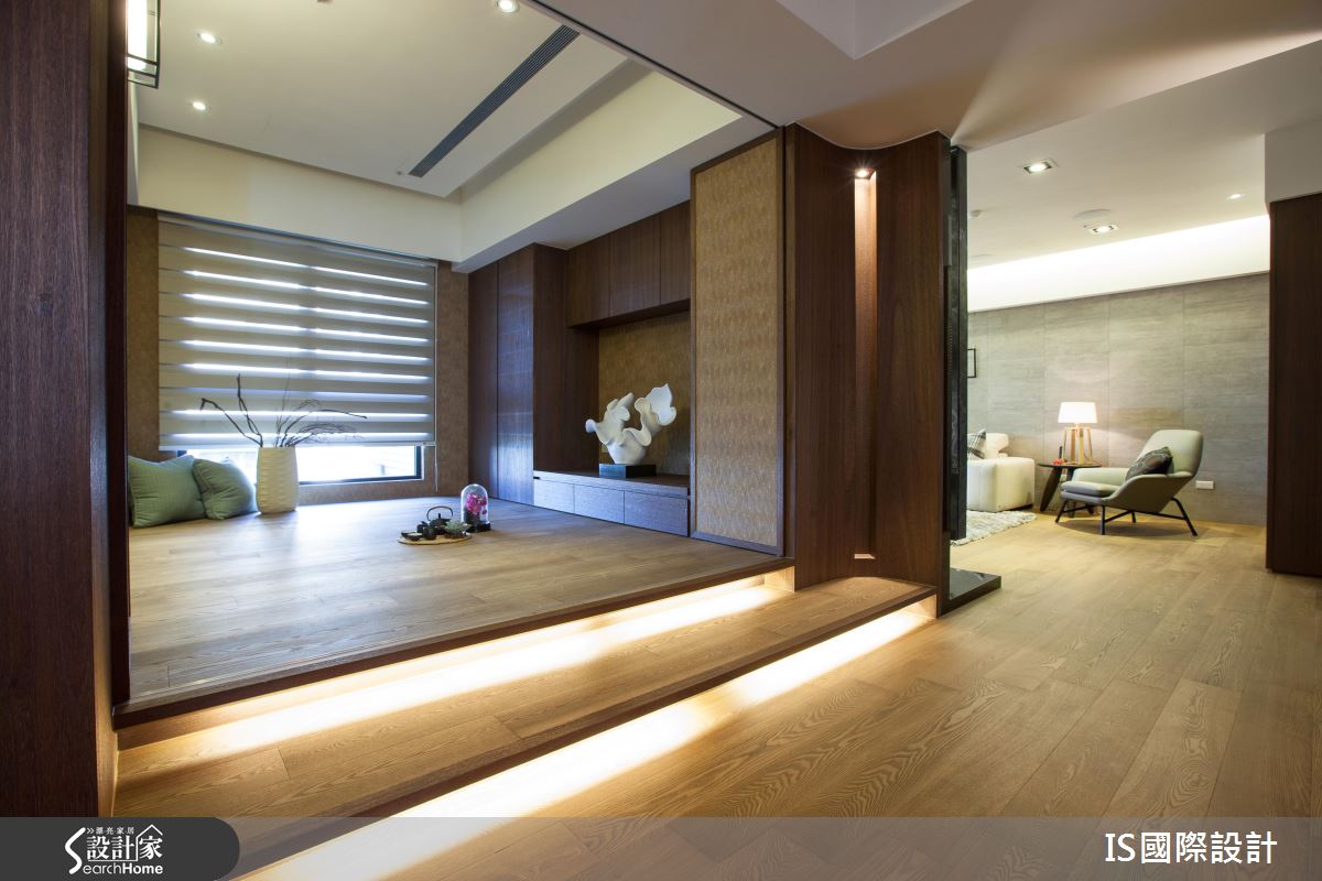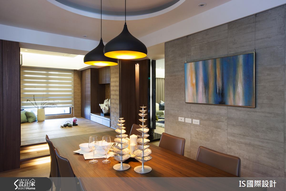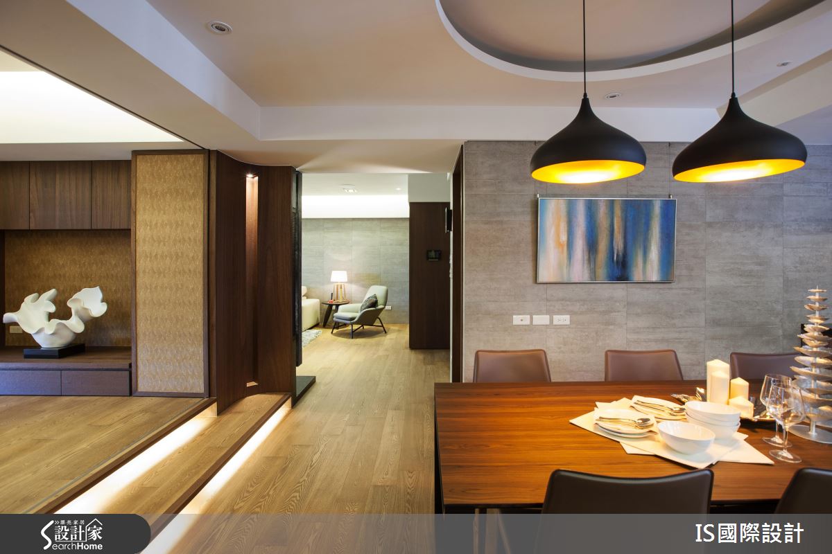 電視牆後方以架高的木地板創造出和室領域,並利用拉門設計彈性界定出內外領域,可依屋主需求隨時作為開闔之用,另一側則延伸公領域的地坪質感,圍塑出餐廚空間,圓形的天花板造型內嵌入照明的手法,加強視覺的明亮度,烘托溫馨的用餐氛圍,無形中也增進家人間互動的情誼。
